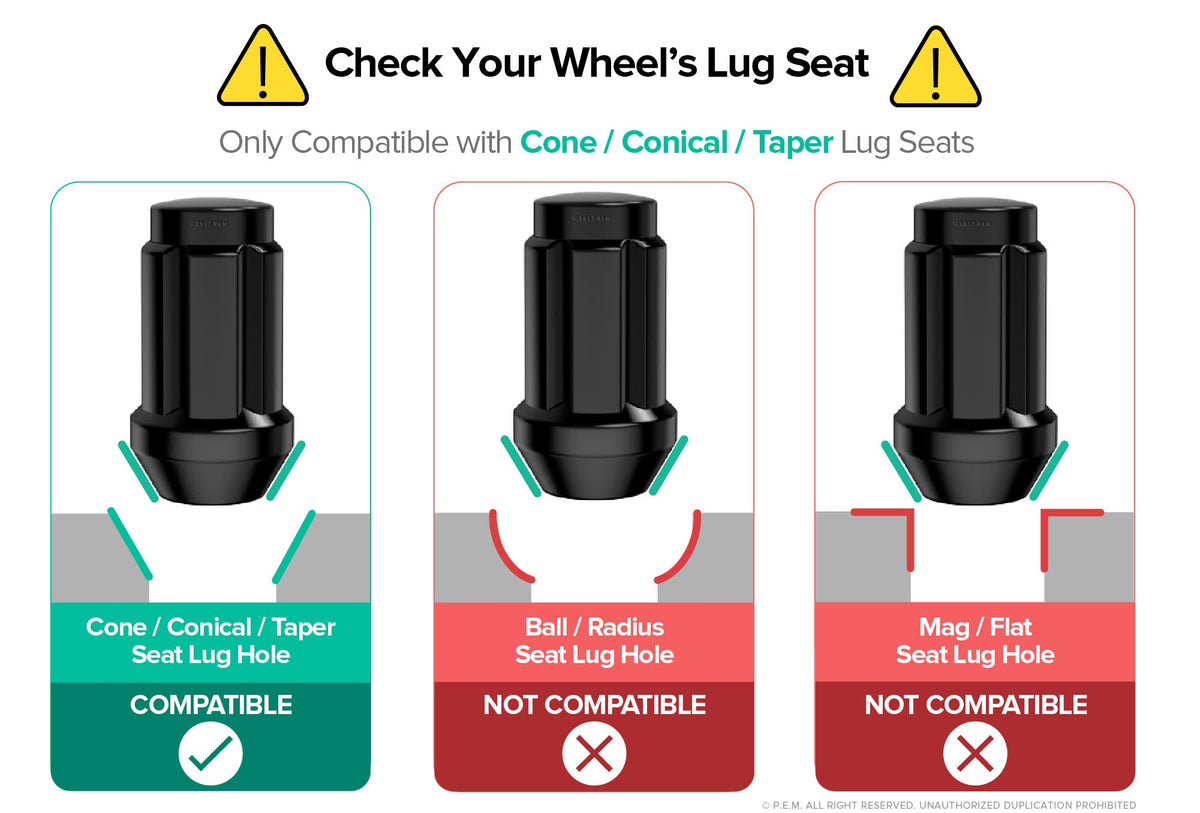 Q: How do I ensure these lug nuts fit my vehicle?A: Before purchasing, confirm that your vehicle has 1/2-20 threaded studs and conical lug holes with a 60-degree taper. It's important to compare the length and width of these lug nuts with the ones currently in use and check the wheel stud length, ensuring it does not exceed 38mm (1.5 inches).