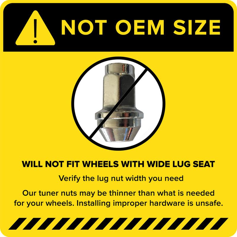 Q: Are these lug nuts suitable for OEM wheels?A: These lug nuts are not OEM parts and may not fit OEM wheels, particularly those with wider lug seats. It is crucial to check your current lug nut size and ensure that these lug nuts are compatible with your specific wheel setup to avoid safety issues.