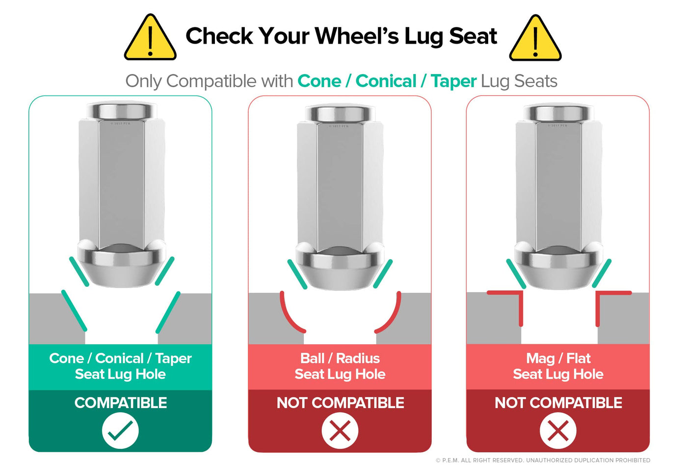 [ SAFETY WARNING ] Before purchasing, Check your current lug nut size (length/width/seat). These are NOT OEM SIZE, and may not fit OEM wheels or wheels made by the manufacturer that need a wider lug seat. Failure to install correct hardware is unsafe and may cause wheel/tire assembly to loosen or fall off while vehicle is in motion. [ SPECIFICATIONS ] Nut Height: 1.80 inches Hex Size: 19mm (3/4') Thread Pitch: 14x1.5 [ FITMENT ] Compatible with JEEP 2018+ Wrangler JL, 2019+ Gladiator JT. Compatible with CHEVROLET 2002-2006 Avalanche 1500, 1988-2000 C2500 (6-Lug), 2003-2014 Express 1500, 1988-1999 K1500, 1994-2000 K2500 (6-Lug), 1999-2020 Silverado 1500, 2000-2014 Suburban 1500, 1995-2020 Tahoe. Compatible with GMC 2003-2005 Safari, 2003-2014 Savana 1500, 2007-2020 Sierra 1500, 2000-2020 Yukon, 2000-2014 Yukon XL 1500. Compatible with Ford 2015-2020 F150, 2015-2020 Expedition. [ IMPORTANT: Check before purchasing ] - Your vehicle must have 14x1.5 threaded studs. - Your wheels' lug holes must have conical / 60 degree cone / taper / acorn / cone seat. - Ensure these lug nuts are the proper size. Compare the length/width of these lug nuts (diagram can be found in the images section) to the nuts you are currently using. - Check vehicle's wheel stud length. If your wheel studs are longer than 48mm (1.89 inches), these nuts will bottom out, potentially causing accident and/or injury.