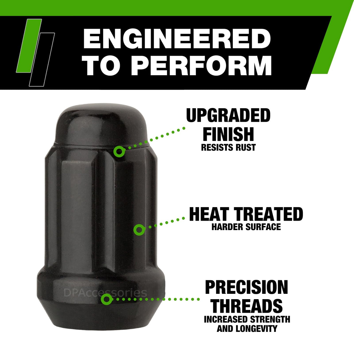 DP-Accessories closed-end spline tuner style lug nuts for aftermarket wheels are among the best in the industry. Our tuner-style wheel nuts (spline drive lug nuts) are crafted with precision machined threads to ensure a perfect fit to your vehicle's wheel studs. Manufactured with cold-forged and heat-treated steel for dependable strength and durability. These lug nuts feature a proprietary cathodic black coating that gives the durability of high-quality chrome and the sharp look of satin black (Also called Black Chrome lug nuts). Won't chip or scratch like painted gloss black lug nuts or matte black lug nuts. Our lengthy multi-point quality control process ensures that every nut we handle is created with the same love and care as the one before it.