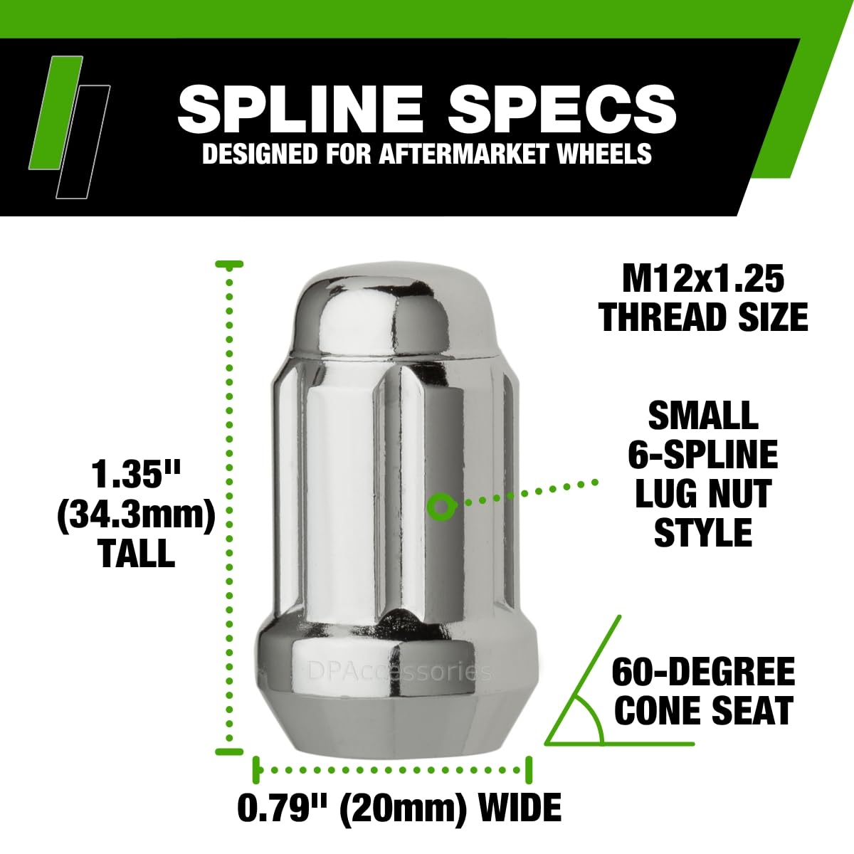Q: What are the specifications of the DPAccessories Chrome Spline Lug Nuts?A: The DPAccessories Chrome Spline Lug Nuts feature a thread size of M12-1.25, a closed-end 6-spline tuner style, a 60-degree cone seat, and dimensions of 1.35 inches in length and 0.79 inches in width.