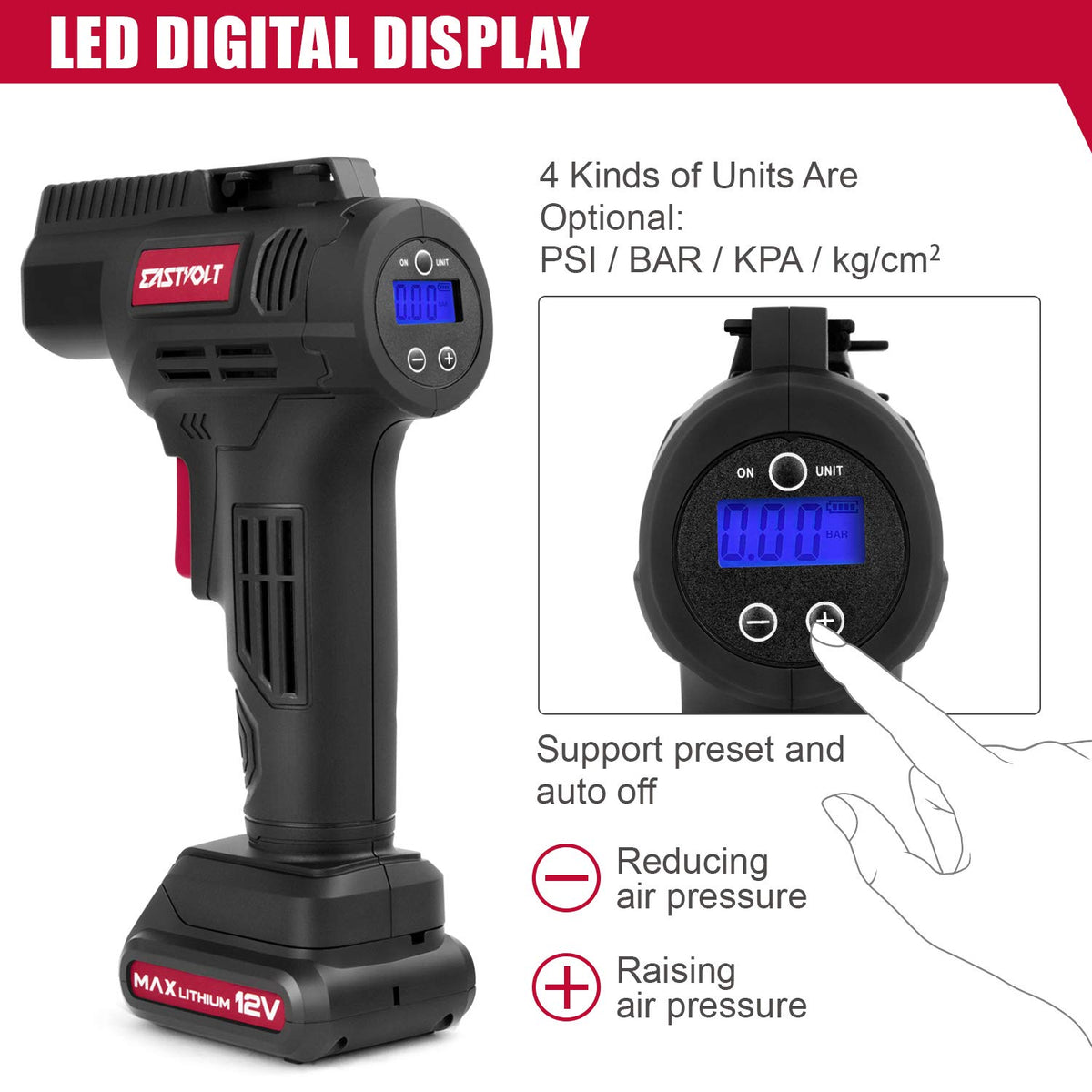 Eastvolt 12V Tire Inflator Air Compressor, Multi-Purpose Electric Power, Max 150Psi With 4-Unit Measurement Gauge, 3 Nozzles, Fast Charger And 1.5 Ah Rechargeable Battery