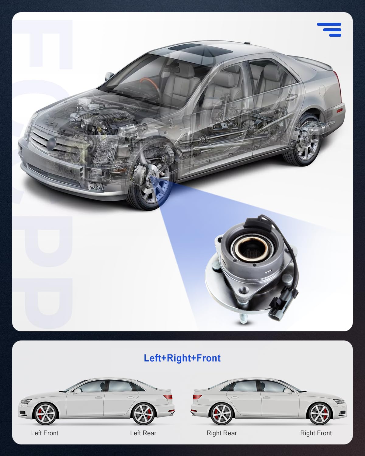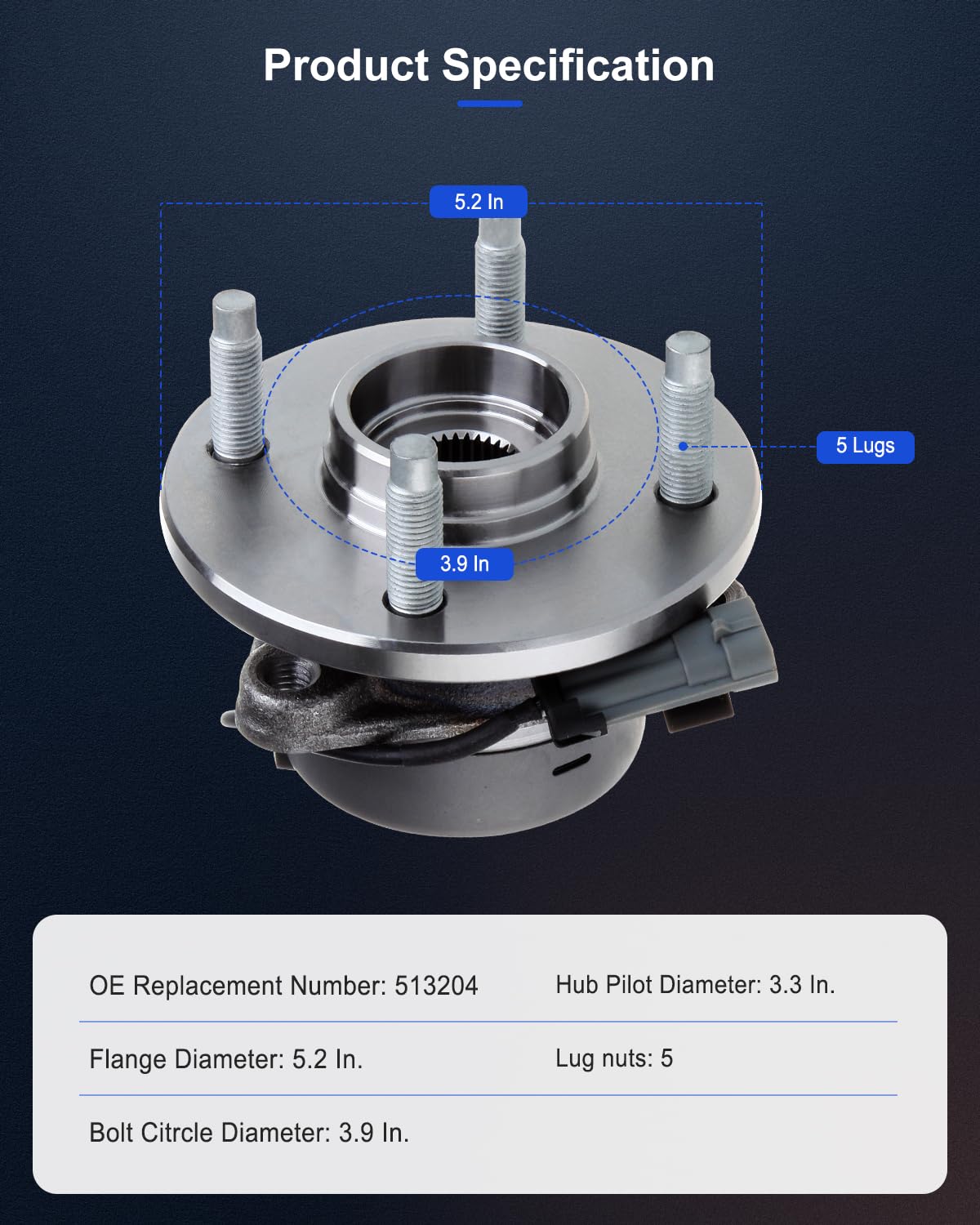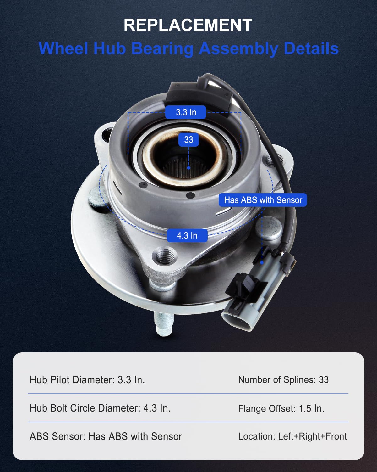 BRAND STORY ECCPP, one of the largest automotive aftermarket parts suppliers online in America, serving professional installers and do-it-yourself customers. Our mission is that brings premium quality automotive accessories to every corner of the world. We aim to provide each customer the best quality auto parts at the best purchasing. Our high-quality products and professional services are looking forward to becoming the first choice For your reliable branded wheel bearing spare parts. Wheel Hub Bearing With Wheel Hub Studs Compatible: 2005-2009 for Chevrolet Cobalt 4-Wheel ABS, 4 Stud Hub 2007-2009 for Pontiac G5 4-Wheel ABS, 4 Stud Hub 2005-2006 for Pontiac Pursuit 4-Wheel ABS, 4 Stud Hub 2004-2007 for Saturn Ion Coupe, 4-Wheel ABS 2003 for Saturn Ion Coupe, Sedan, 4-Wheel ABS 2004-2007 for Saturn Ion Sedan, 4-Wheel ABSDetails:Flange Diameter: 5.2 In.Bolt Circle Diameter: 3.9 In.Wheel Pilot Diameter: 2.2 In.Brake Pilot Diameter: 2.4 In.Flange Offset: 1.5 In.Hub Pilot Diameter: 3.3 In.Hub Bolt Circle Diameter: 4.3 In.Bolt Quantity: 5Bolt Hole qty: 3ABS Sensor: YesNumber of Splines: 33Package Including:1 Pc wheel hub bearing