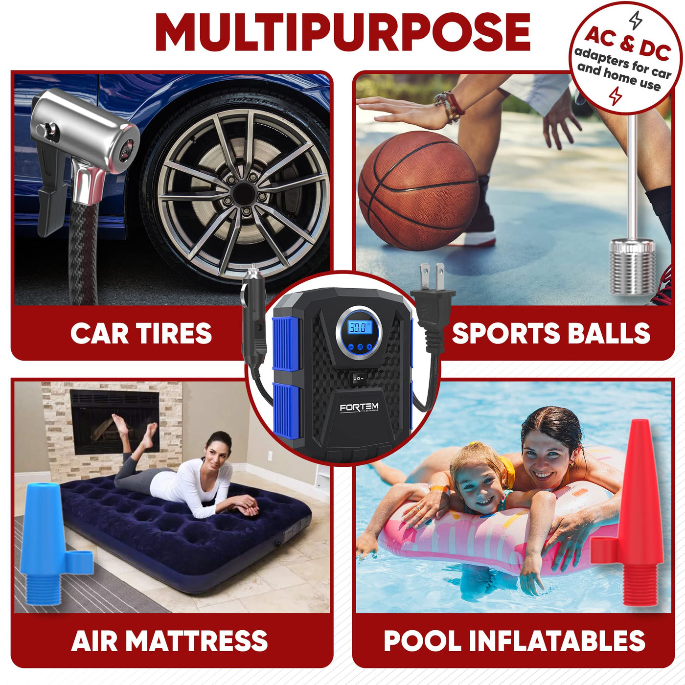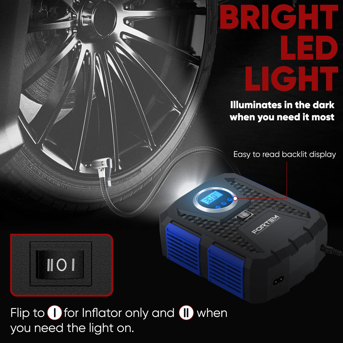 Fortem Tire Inflator 150 Psi, Bike Pump, 112V Ac 12V Dc Air Pump For Car Tires, Digital Tire Pressure Gauge W/Auto Pump/Shut Off, Carrying Case (Blue)