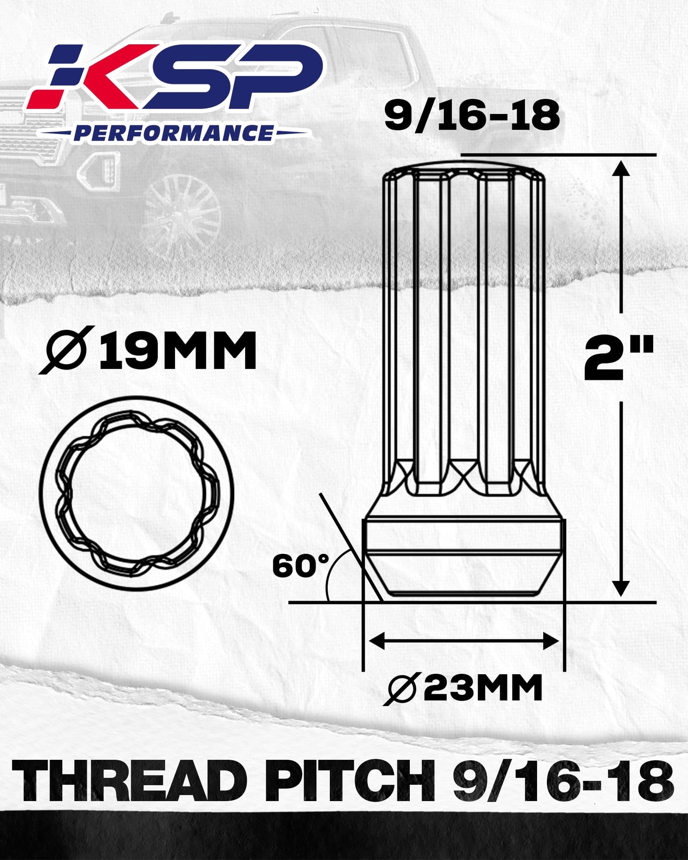 Q: What vehicles are compatible with KSP 9/16-18 Lug Nuts?A: The KSP 9/16-18 Lug Nuts are compatible with vehicles that have a 9/16-18 thread pitch and a 60-degree conical seat. This includes models such as the 1994-2011 Dodge Ram 1500, 2500, 3500, and the 1988-1998 Ford F250 and F350.