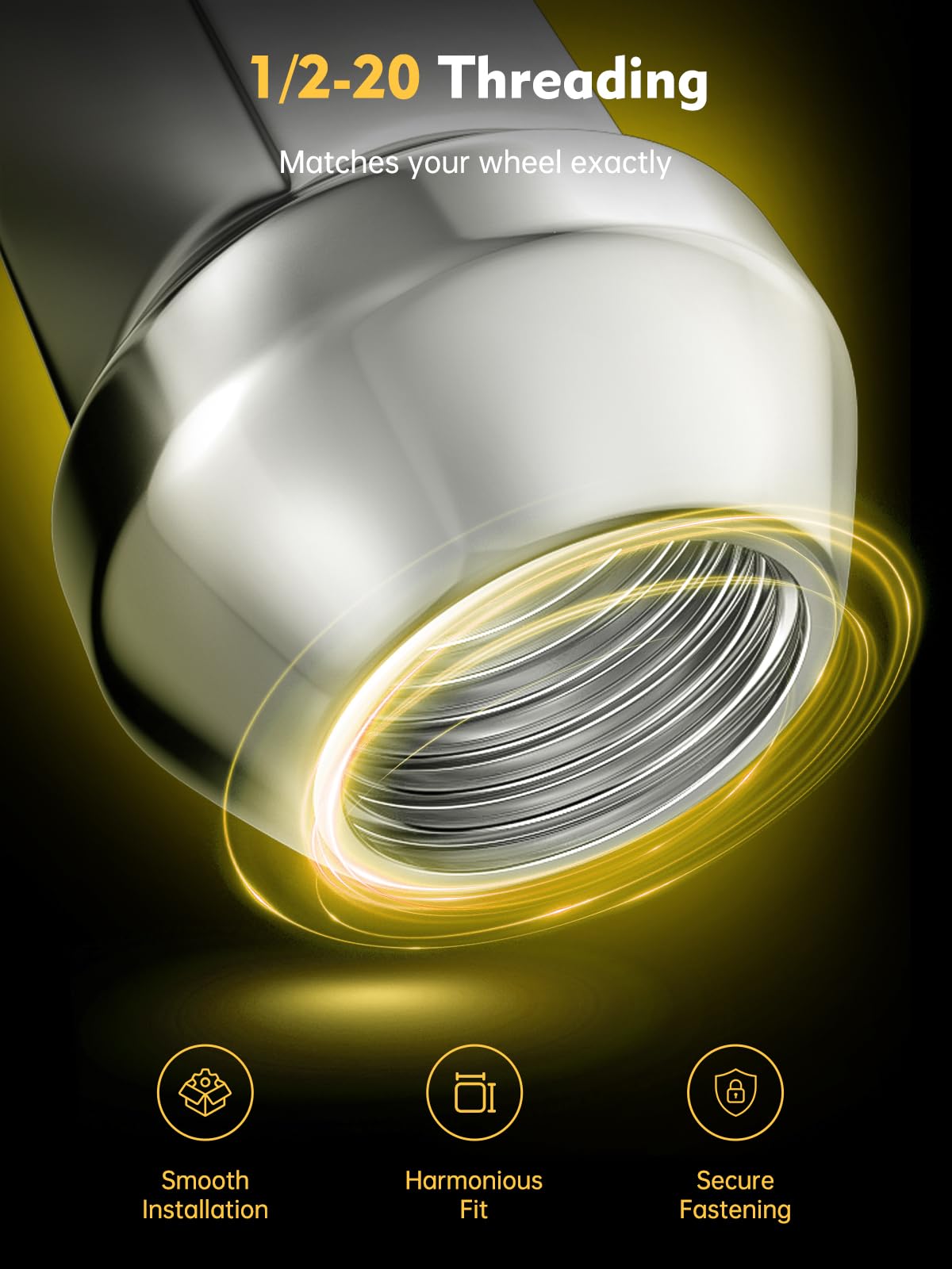 Q: What is the thread specification and size of these lug nuts?A: The MIKKUPPA lug nuts have a 1/2-20 thread size, with a closed end bulge style and a conical 60-degree seat. They are designed with a 19mm hex, measuring 1.4 inches long and 0.87 inches wide, ensuring a perfect fit for your vehicle's wheel studs.