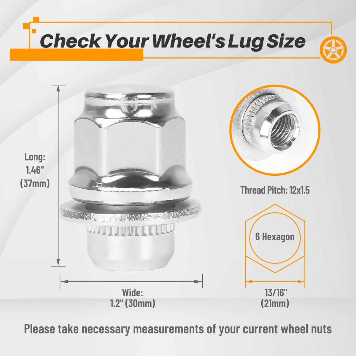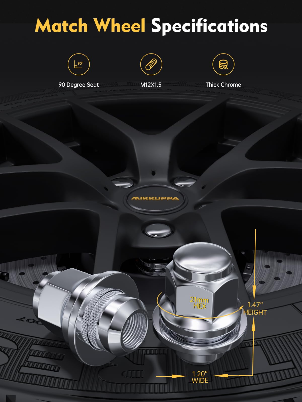 Q: What is the size of the MIKKUPPA lug nuts?A: These lug nuts feature an M12x1.5 thread size, with a 13/16 inch (21mm) hex and a height of 1.46 inches (37mm), making them suitable for various vehicle applications.