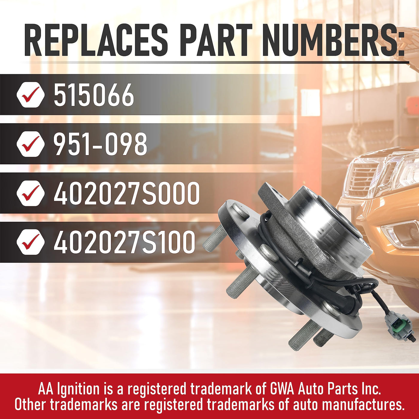 The wheel hub bearing is a crucial part of the drivetrain as it enables the wheels and tires to rotate smoothly without friction. Wheel hub bearing problems can easily be identified by loud noises from the wheel area, loose steering or unwanted movement, vibration and uneven tire wear. Installation is easy with no special tools required and it will fit, look, and work like the factory wheel hub bearing. Please ensure that your vehicle has 6 lug counts before purchasing. Fits the front left or right of following vehicles: 2004-2007 QX56 2005-2007 Armada 2004 Pathfinder Armada 2004-2007 Titan Replaces part numbers: 515066, 951-098, 402027S000, 402027S100 This is a compatible replacement part manufactured by AA Ignition. This wheel bearing hub is NOT a genuine OEM part. Vehicle makes and their associated vehicle models and part numbers are used in this listing only to identify the vehicles this wheel bearing hub assembly fits.