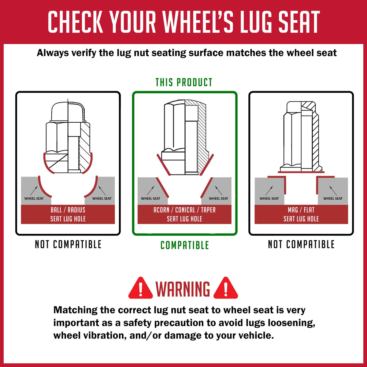 Q: What is the thread size and configuration of these lug nuts?A: These lug nuts have a 9/16"-18 thread size and a 60-degree taper conical seat, ensuring a secure fit for your vehicle's wheels.