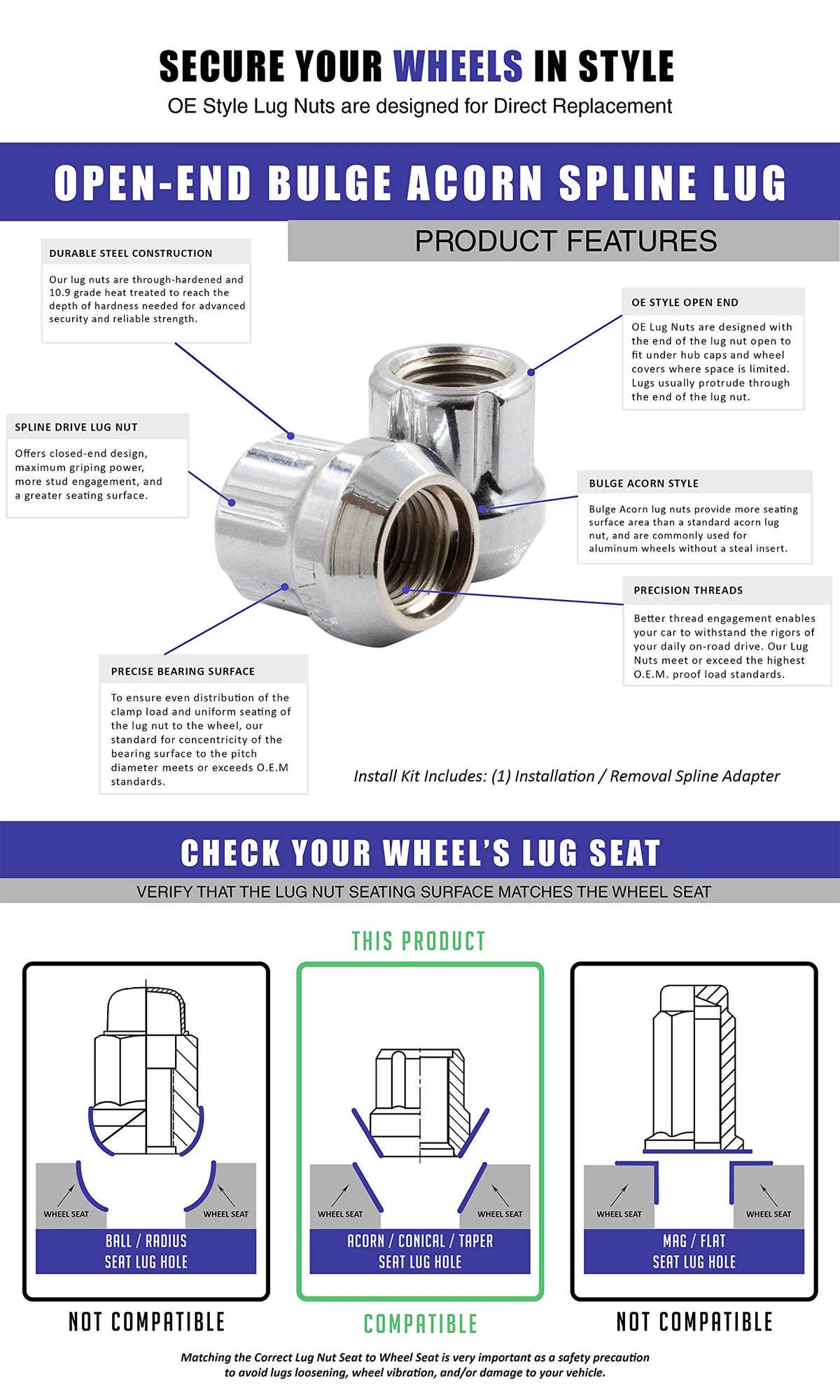 Wheel Accessories Parts Set Of 20 Chrome M12X1.25 Small Diameter Lug Nuts Bulge Acorn Spline Drive Open End 0.85'(21.5Mm) Long With Dual Hex Key (20, 12X1.25, Chrome)