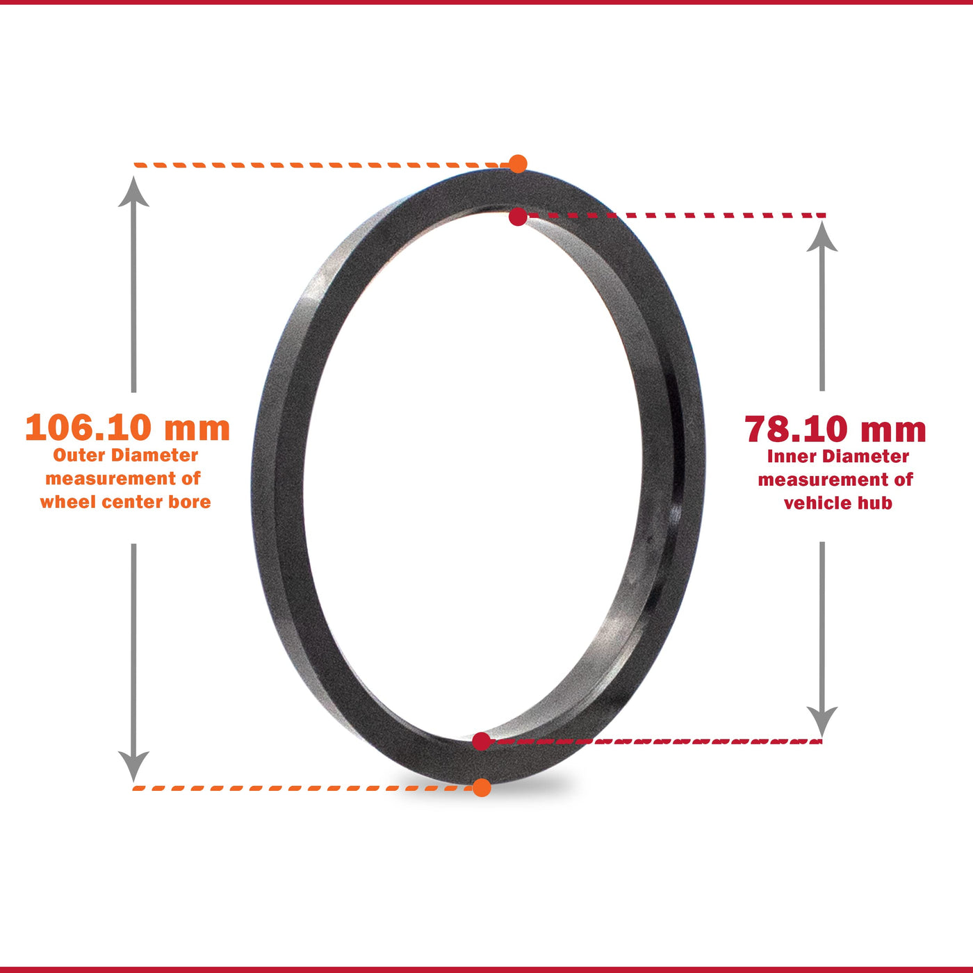 Wheel Accessories Parts Set Of 4 Hub Centric Ring 106.10Mm Od To 78.10Mm Hub Id, Black Polycarbonate (Wheel Hub Ring, 4 Pack, 10