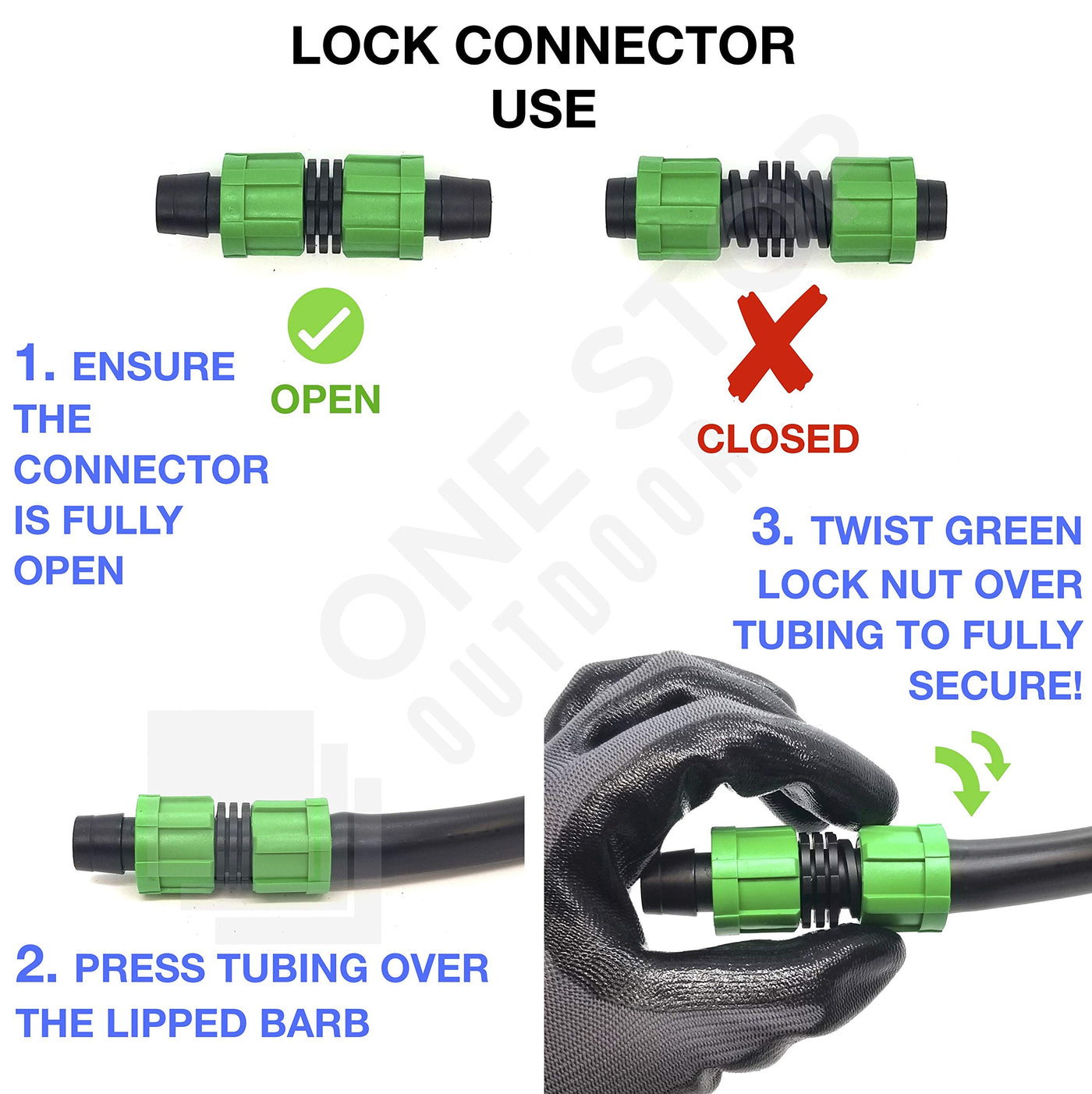 UNIVERSAL LOCKING DRIP FITTINGS : 16 and 17 mm (1/2") Barbed Fittings FIT MOST MAJOR BRANDS 1/2” DRIP TUBING : Barbed Drip Fittings with twist lock are used in the installation of drip line with .600 ID x .700 OD drip tubing. Used by home gardeners and professional alike, these fittings are made of high-impact plastic, and are available in a variety of configurations. Using a barb, two pieces of drip line or drip tubing may be pushed over the barbed sides of the fittings for a very tight fit. Features Special, extra lock twist and barb design for secure and easy installation without glue or clamps Fits brown or black drip tubing, PC drip line and polyethylene drip tubing with .600 ID x .700 OD or .550 ID to .600 OD - QUALITY CONSTRUCTION - Made of high-impact, high-strength, UV-resistant plastic for extended operation in harsh conditions Available in a variety of configurations Products specifications Operating pressure: up to 30 PSI