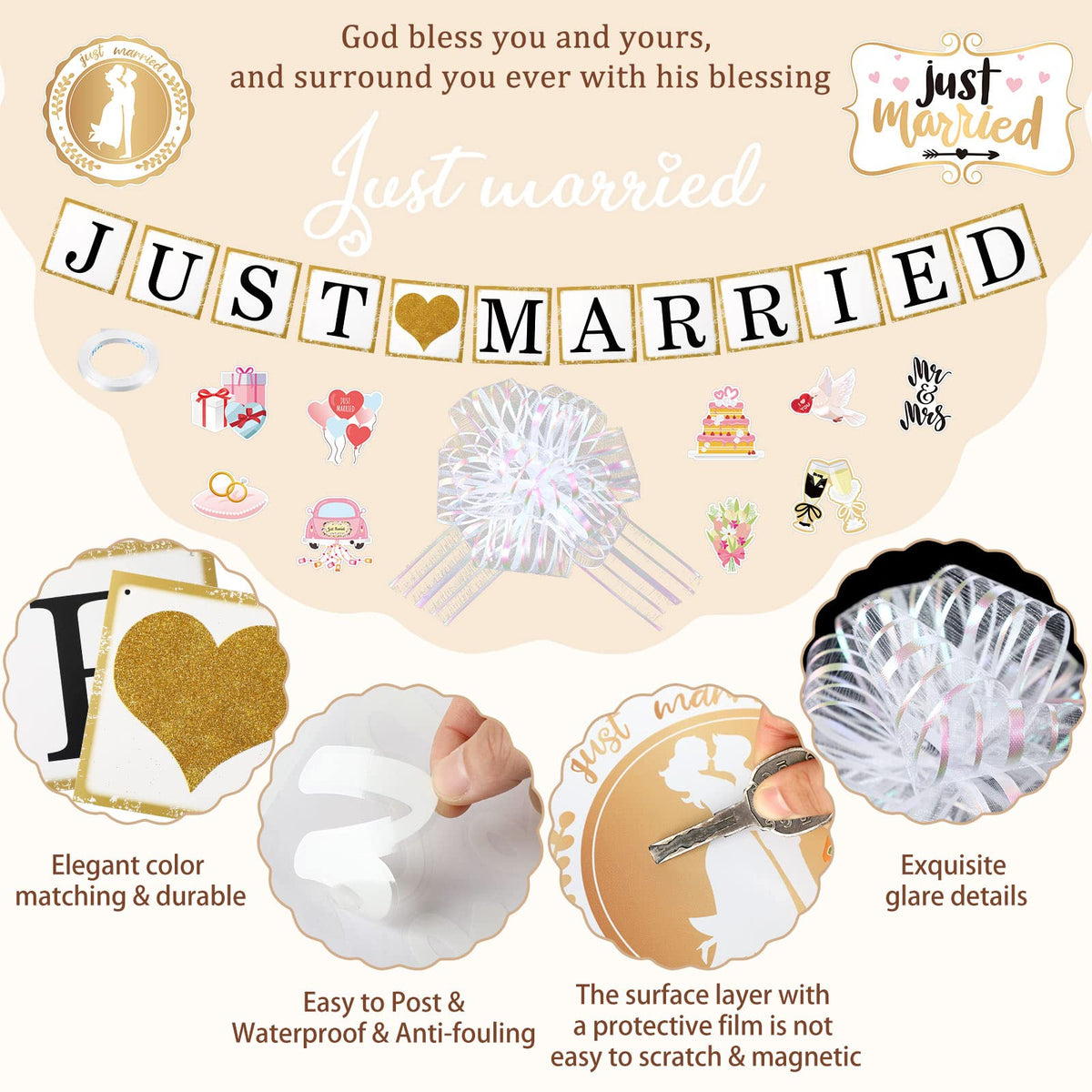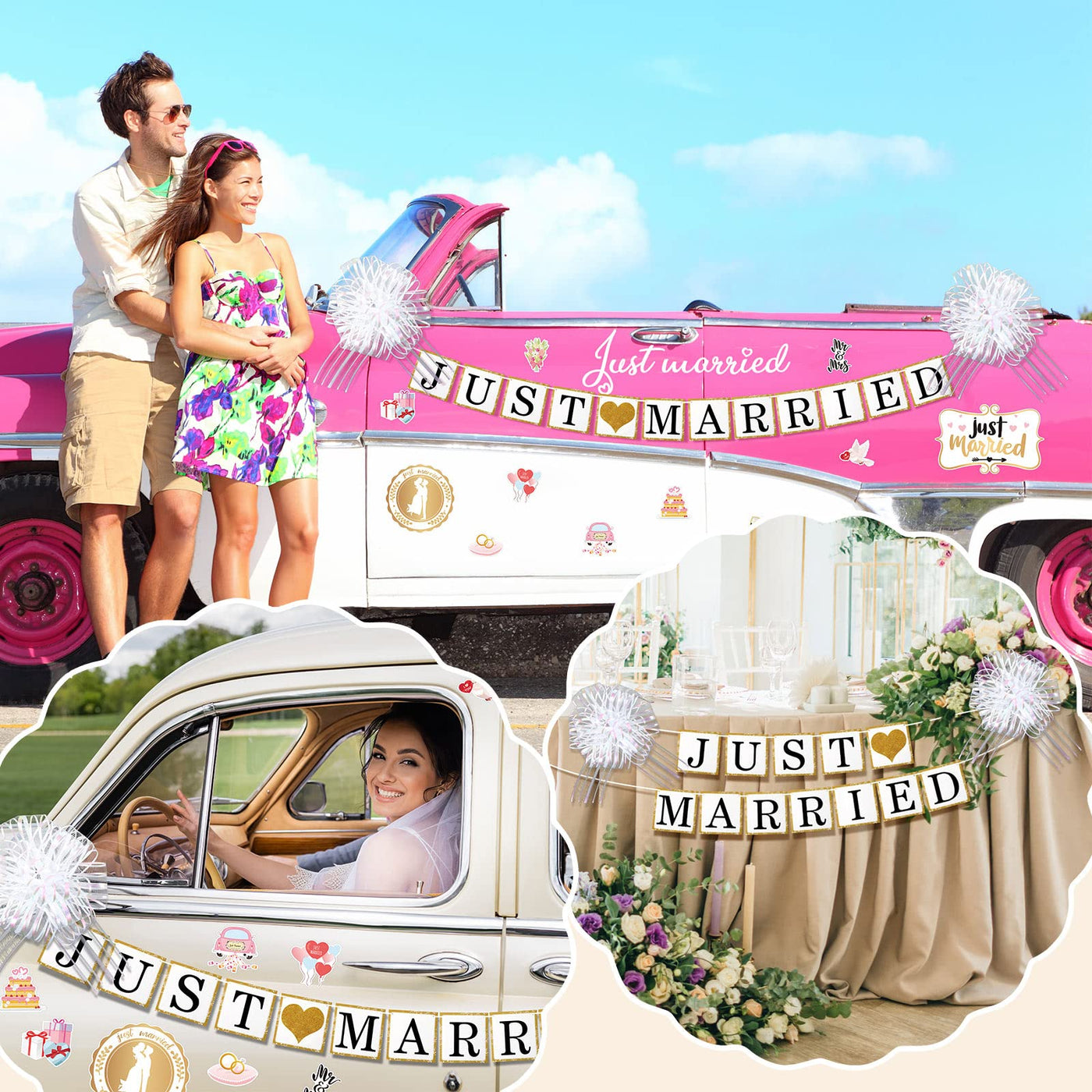 18 Pcs Just Married Wedding Car Decorations Include 12 Just Married Ornate Car Magnets Window Decal Sign Banner 4 Organza Pull B