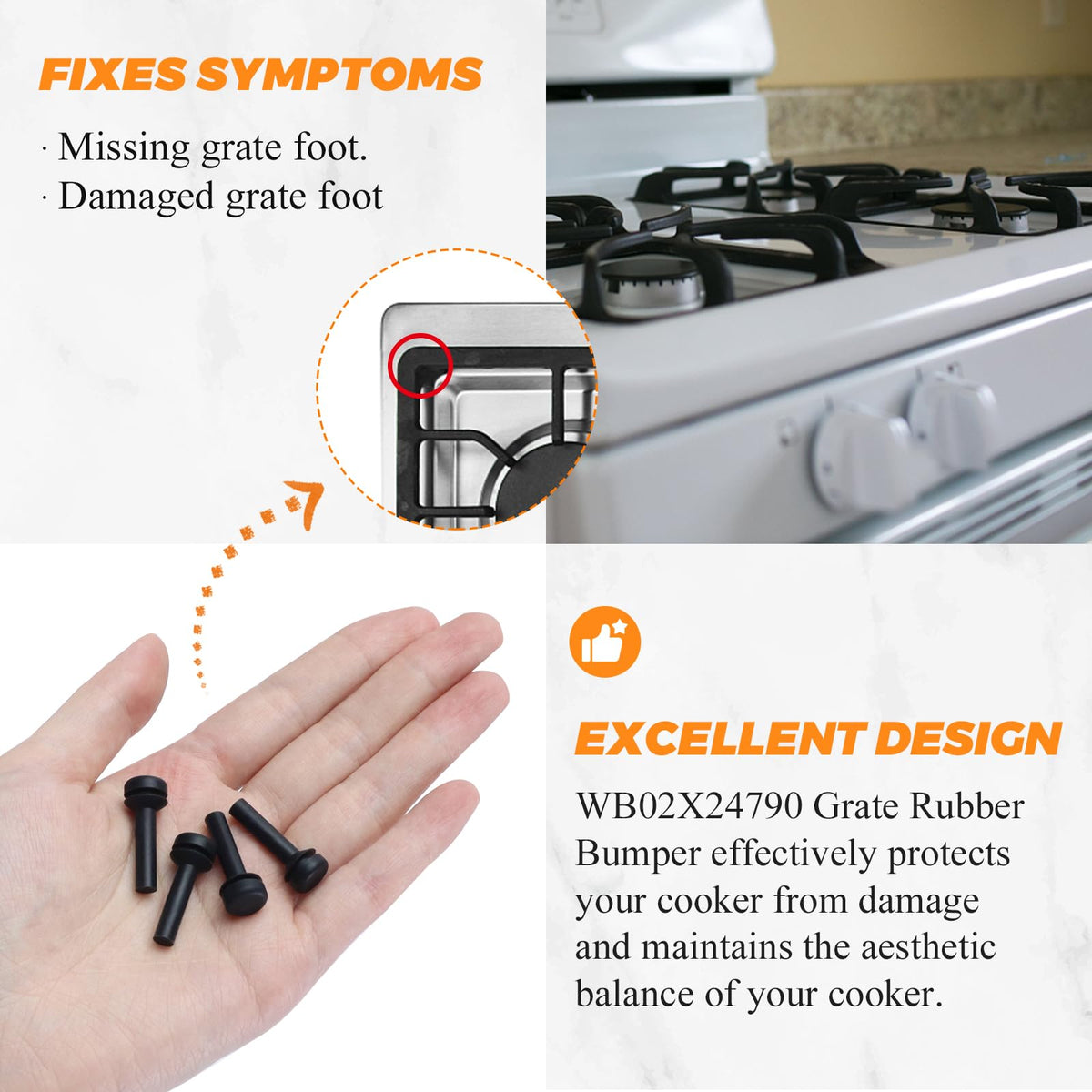 PRODUCT DESCRIPTION: :WB02X24790 Gas stove rubber grate bumper designed replacement for ge range burner grate,with heat resistance 220-250?. WB02X24790 Gas stove rubber grate bumper designed replacement for ge range burner grate. Made of strong and solid rubber, excellent process, rigorously tested by the manufacturer, wear resistant, longevity. 24 grate feet help to unify the aesthetics of your cooker.Replacing our GE Stove Parts Rubber Grate Bumpers will protect the hob and prevent the grate from scratching the hob, and will also make the grate more stable.