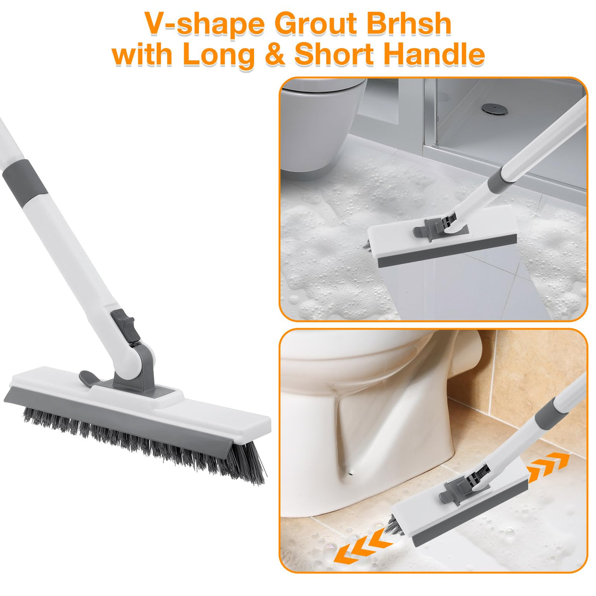 Q: Can I replace the brush heads on the cleaning tool?A: Yes, the 4 in 1 Shower Scrubber comes with 5 replaceable brush heads, including a stiff bristle brush, two sponge brushes, a microfiber cloth, and a v-shape grout brush. You can easily slide out the brush head from the top of the pole and replace it as needed for different cleaning tasks.