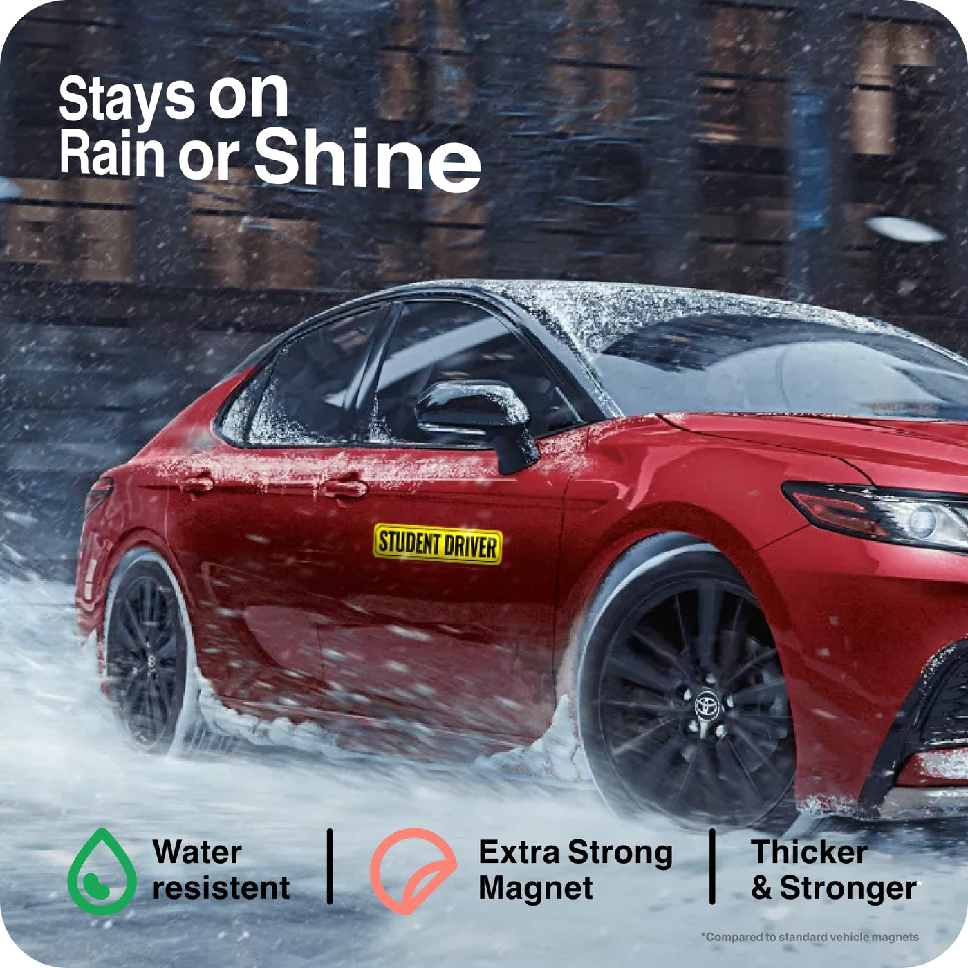 Q: Will the magnet stay in place during inclement weather?A: Yes, the Adheisign Student Driver Magnet is constructed with a heavy-duty, weather-resistant material that ensures it remains securely attached, even in rain, snow, or windy conditions.