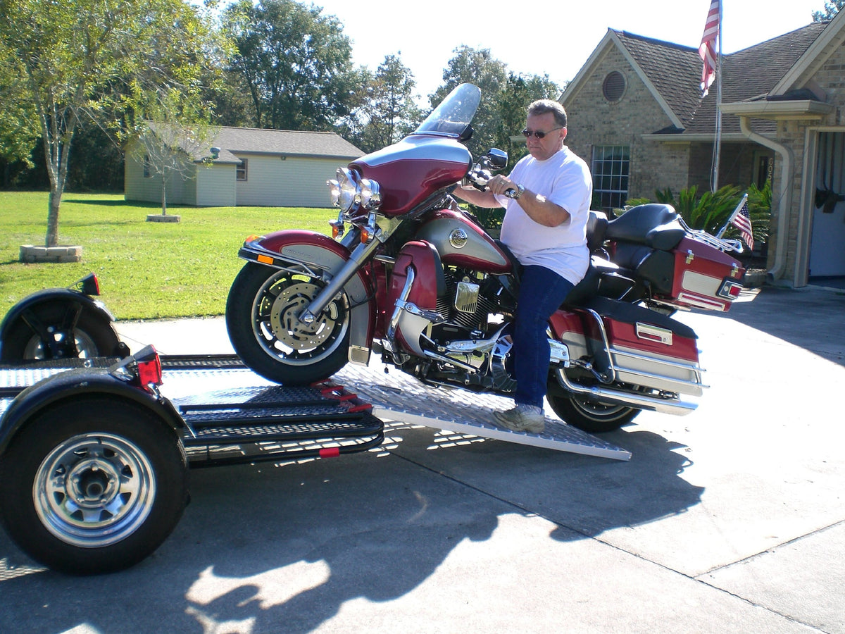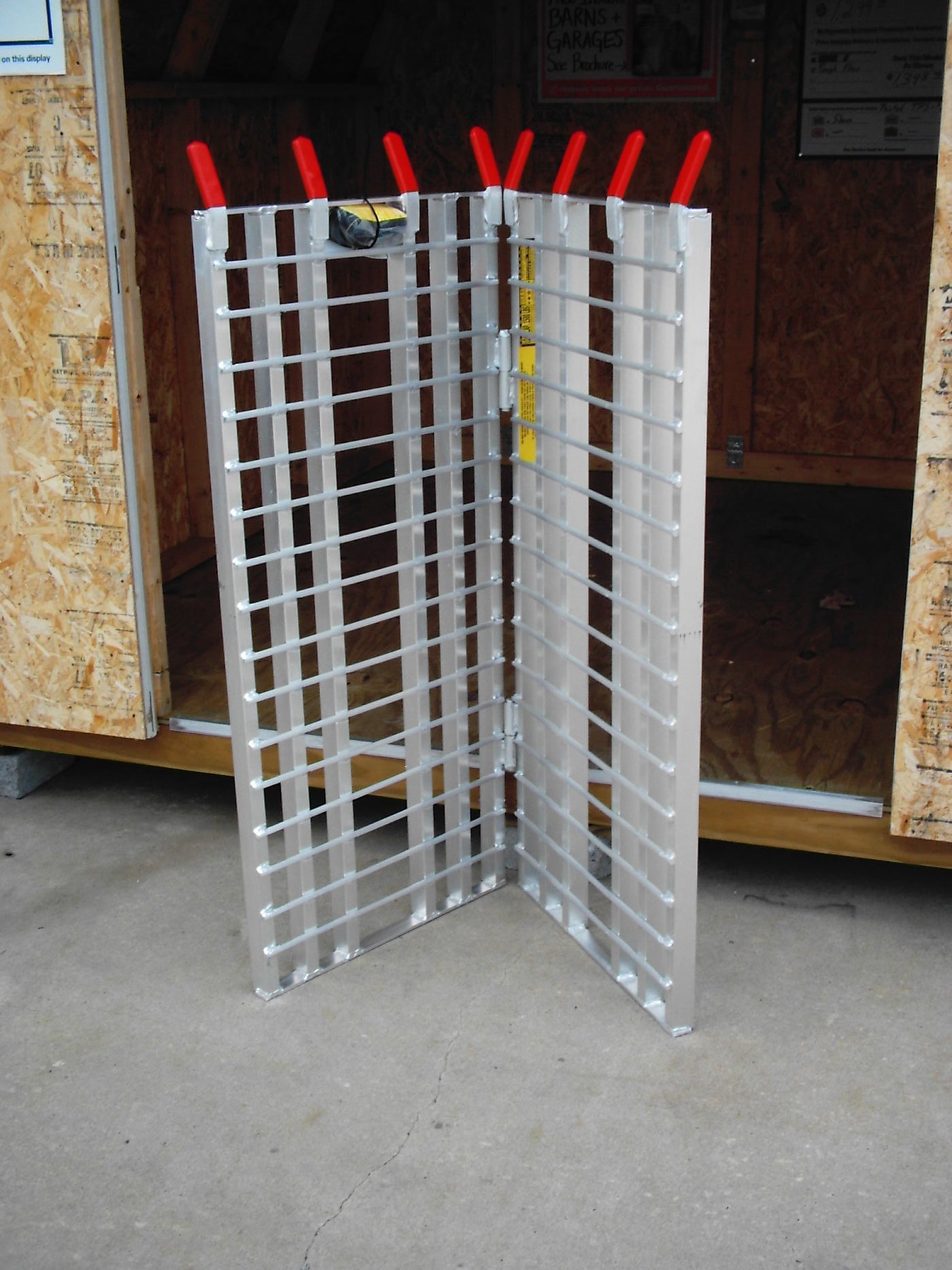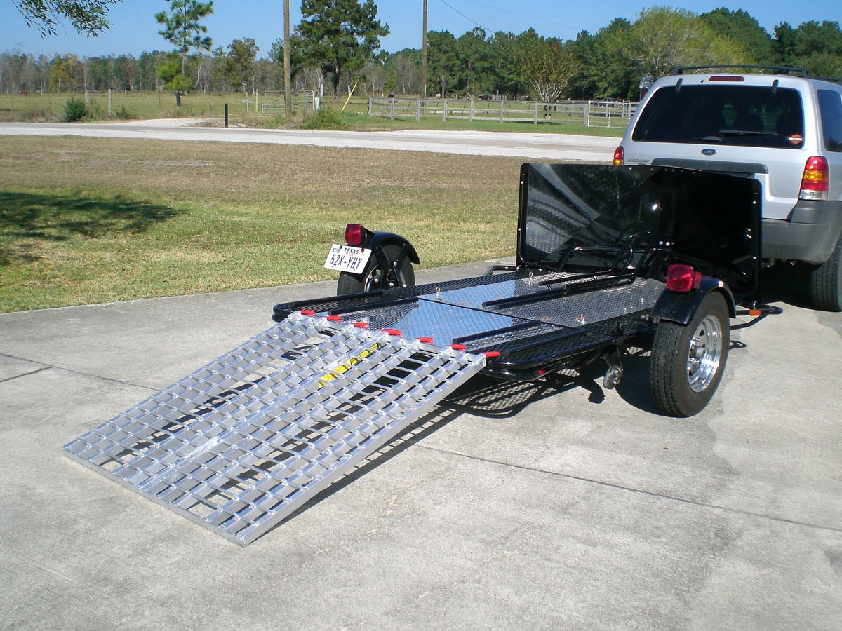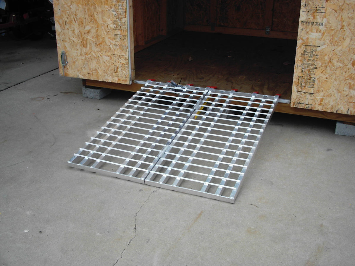 Folding Aluminum Ramp Made in the USA by Five Star Mfg. Model # 5244MCDR *Photos depict loading onto a trailer 12" high * This ramp is specially designed for loading motorcycles onto trailers. Can also be used for loading items into a shed. Eliminate the worry of safely loading your motorcycle. The ramp is 4 feet long by 44 inches wide (folds to 22 inches wide), giving you plenty of room to ride up the ramp while safely planting your feet. Most ATV ramps are rated for four wheel distribution and will fail under the weight of the largest cruisers riding up the middle of the ramp. Whereas this ramp handles the center weight and delivers under the most extreme circumstances! This ramp comes complete with two cam buckle tie down straps to safely secure the ramp to the trailer. For large cruisers, this ramp works well when loading onto surfaces up to 12" high. For trailer surfaces higher than 12" it is recommended that you use either a 6 ft. long ramp or the 7 ft. version.