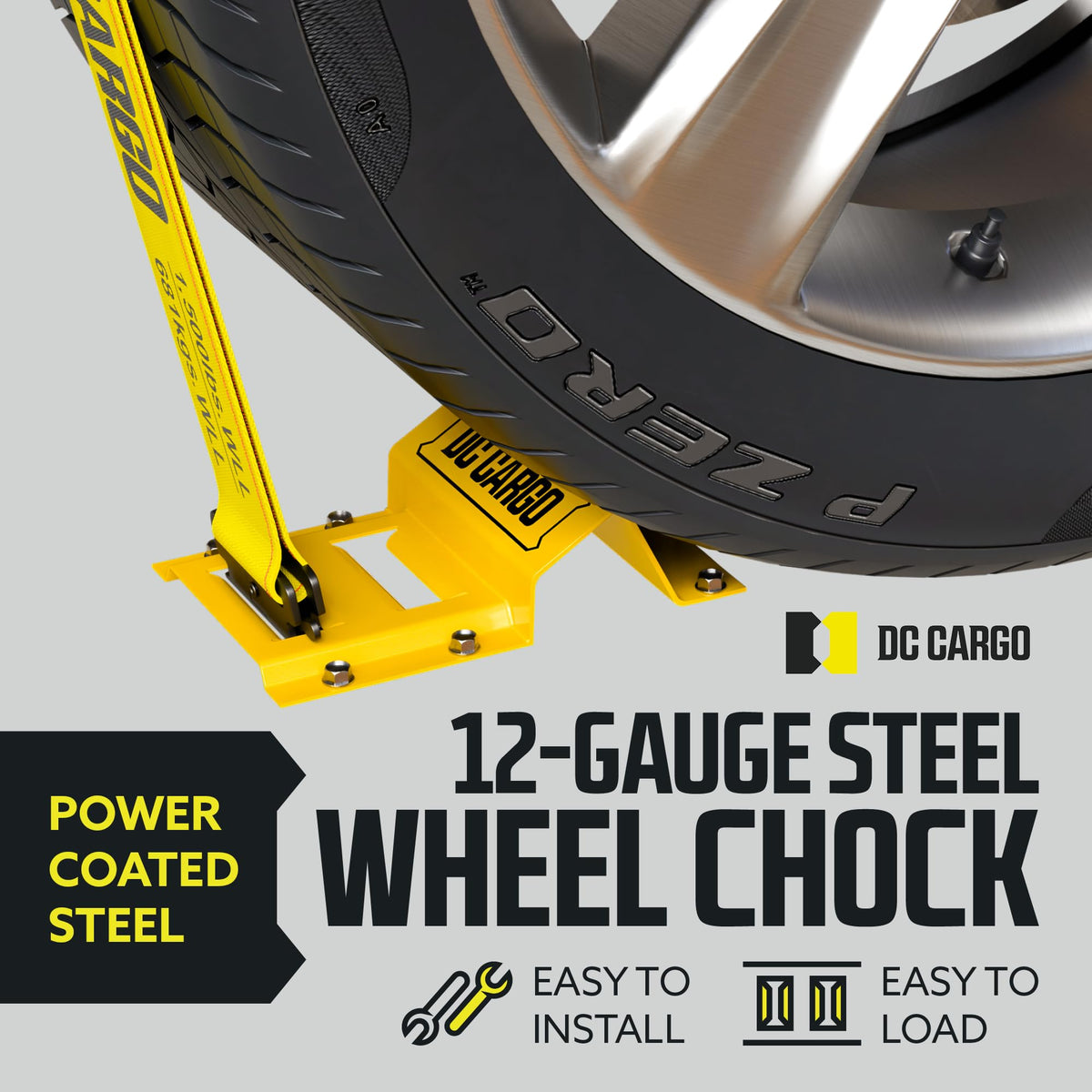 Q: What materials are used in the construction of the straps and chocks?A: The tie-down straps are made from heavy-duty polyester with reinforced stitching for added durability, while the wheel chocks are constructed from 12-gauge powder-coated steel, ensuring rust resistance and long-lasting performance.