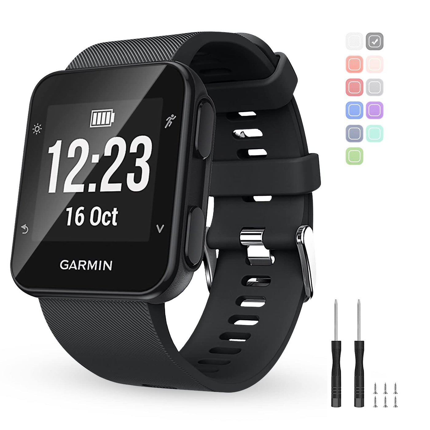 Q: What colors is the BaayCerrie replacement band available in?A: The BaayCerrie replacement band comes in various colors, allowing you to personalize your Garmin Forerunner 35 smartwatch to match your outfits and mood, making it perfect for both daily wear and sports activities.