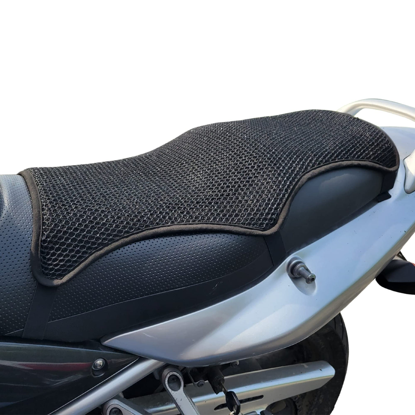 Q: What materials are used in the construction of this motorcycle seat cushion?A: The cushion is made from semirigid multidimensional polyester mesh, which provides durability while maintaining breathability. This material is specifically chosen to ensure that the seat cushion stays cool in the sun and remains comfortable during long rides.
