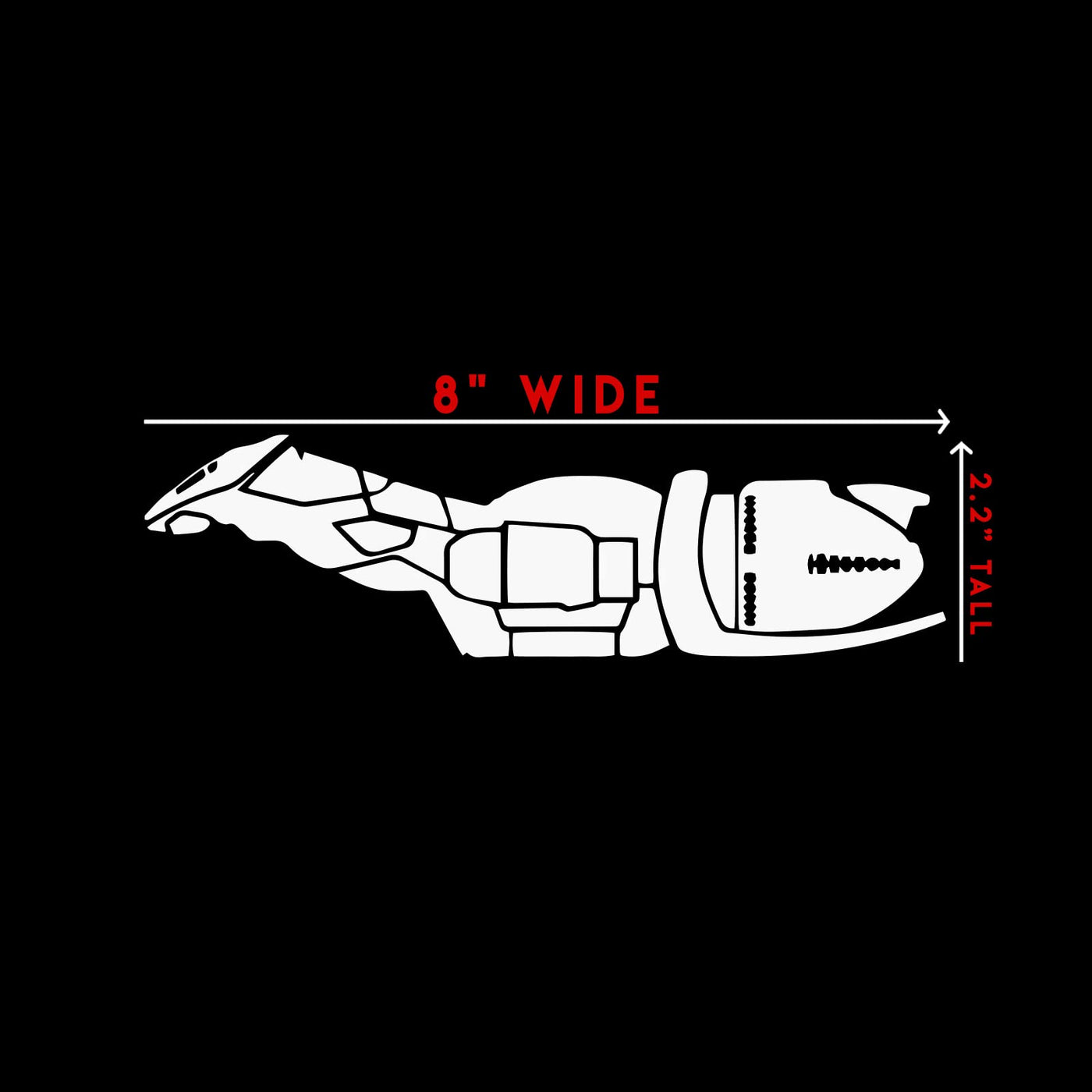 Q: What size is the Firefly Class Serenity Ship Sticker?A: The Firefly Class Serenity Ship Sticker measures approximately 8 inches, making it a noticeable yet not overpowering decoration for your chosen surface.