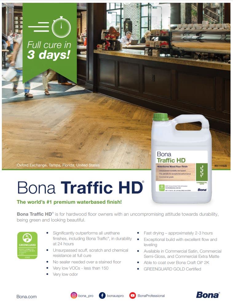 The world's leading waterborne finish, providing unsurpassed scuff, scratch and chemical resistance. Bona Traffic HD is for hardwood floor owners with an uncompromising attitude towards durability, lasting beauty and sustainable solutions. Significantly outperforms all urethane finishes, including Bona Traffic, in durability at 24 hours. Very low VOCs - less than 150 g/L, nonflammable and non-offending odor.
