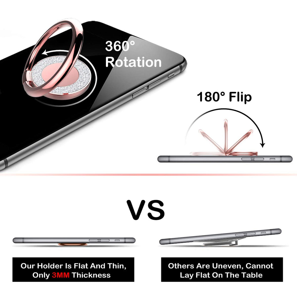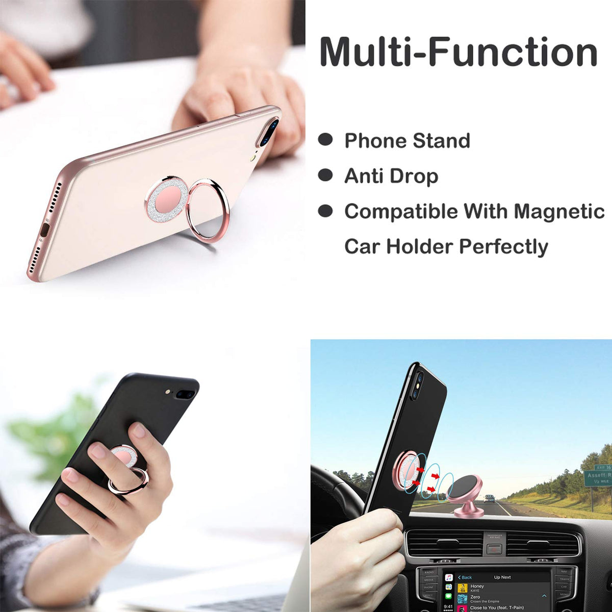 Multi-Function: As a phone grip, adhesive is extremely sticky, which tightly hold your phone and prevent possibility of dropping phone on many occasions. As a table kickstand, the finger ring phone holder features great tightness, so you can adjust it and turn it around and it stays firmly once fixed. As a metal plate, the finger ring for phone is also work great with magnetic phone car mount.