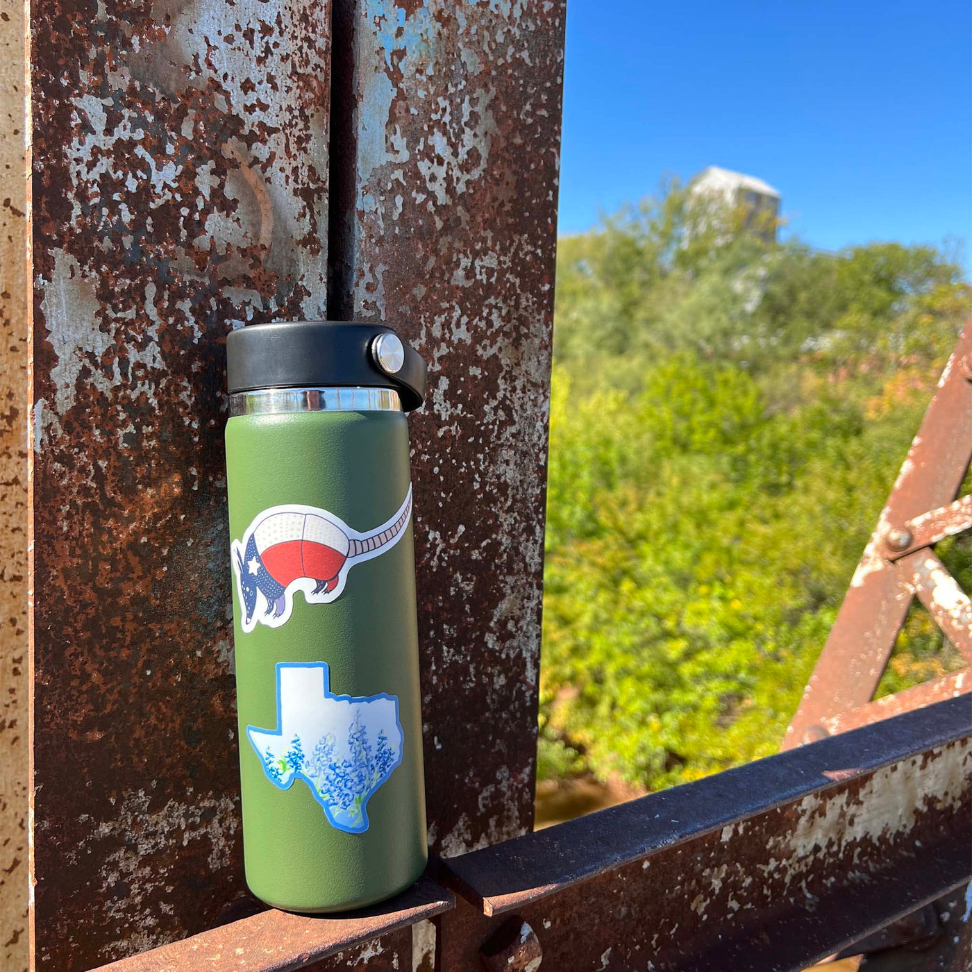 Armadillo Texas State Flag Sticker. 4.25'' Wide X 1.25'' High Water Bottle Decal Size. Durable Die-Cut Vinyl Decal With A Matte Uv-Resistant Coating. Waterproof & Weatherproof For Indoor & Outdoor Use. Made In Usa. The Red White And Blue Texas Flag With Its Single Star Is An Iconic Symbol Of The State Along With The Tough And Resilient Armadillo. Celebrate The Lone Star State With This Cute Texas Sticker Die-Cut In The Shape Of The Texas State Animal, The 9-Banded Armadillo!