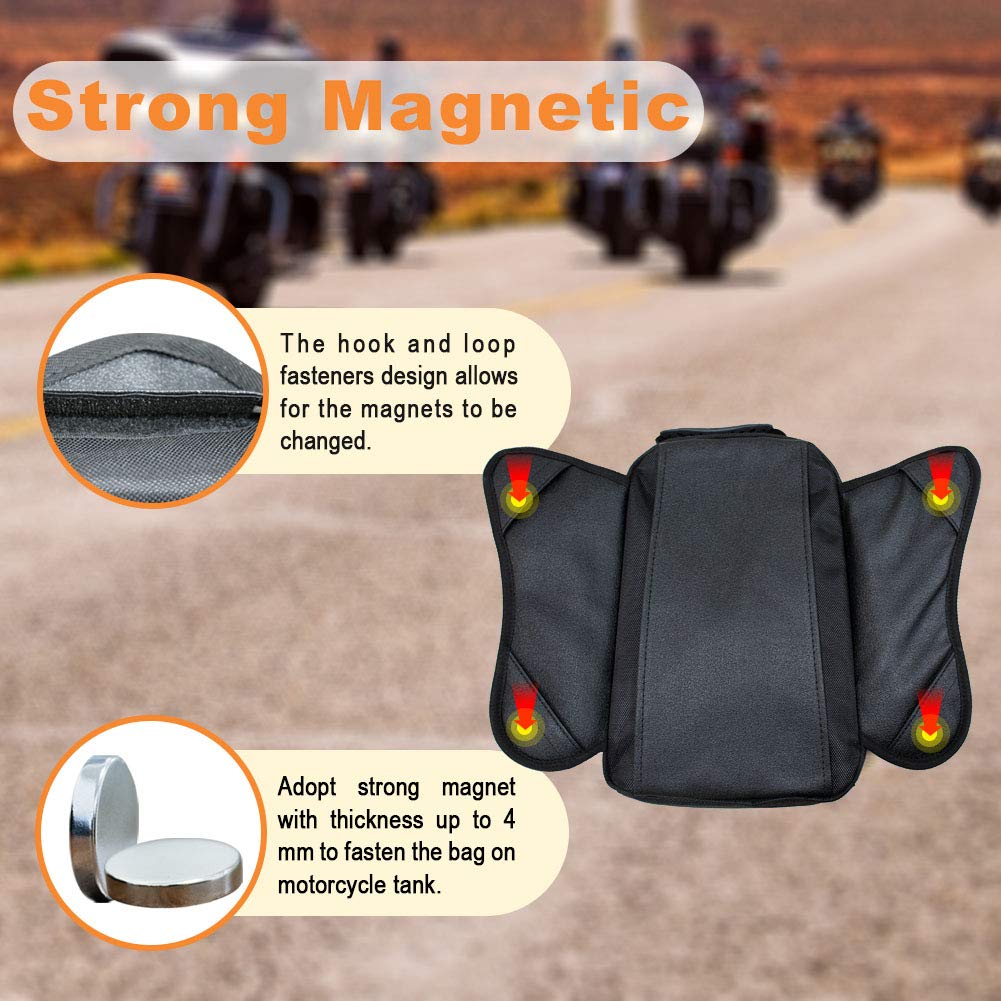 Q: How does the magnetic attachment work for the tank bag?A: The tank bag features a powerful magnetic base that securely fastens it to your motorcycle tank. Additionally, it comes with a fasten belt and buckle for extra security, ensuring that the bag remains in place during rides.