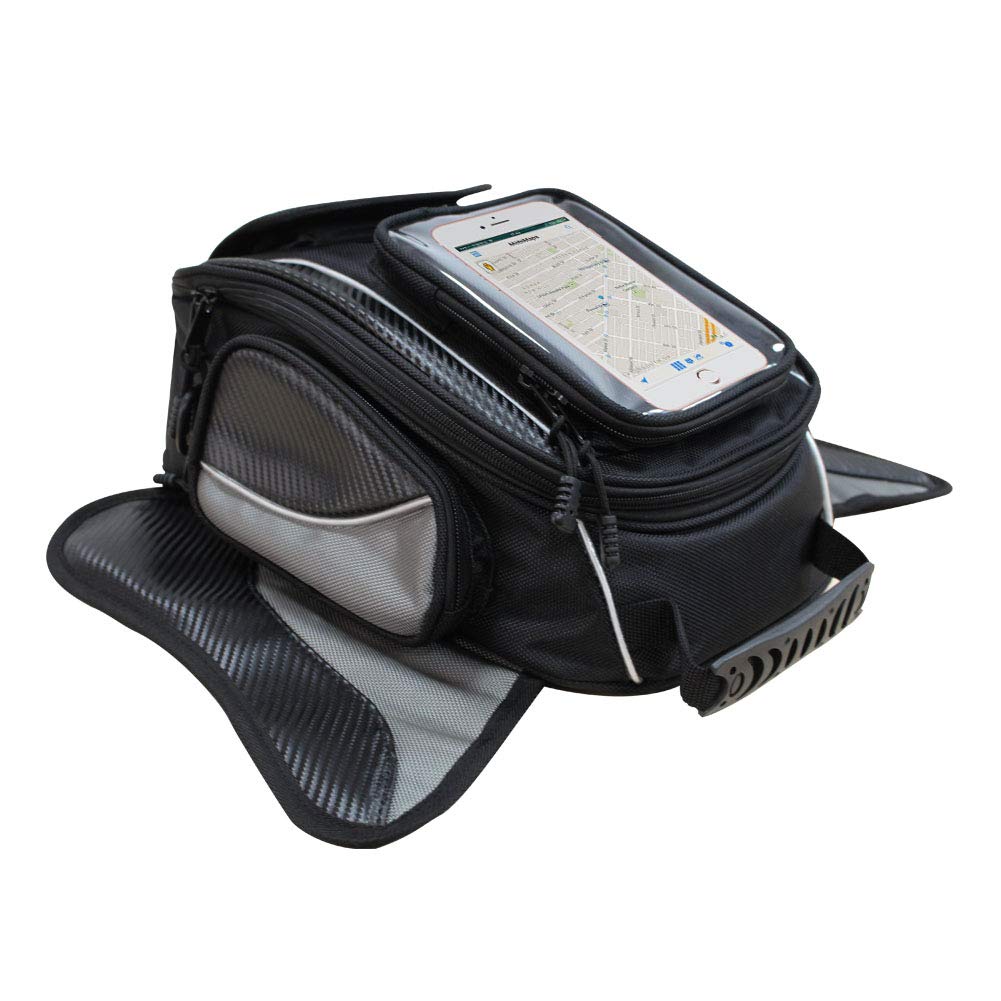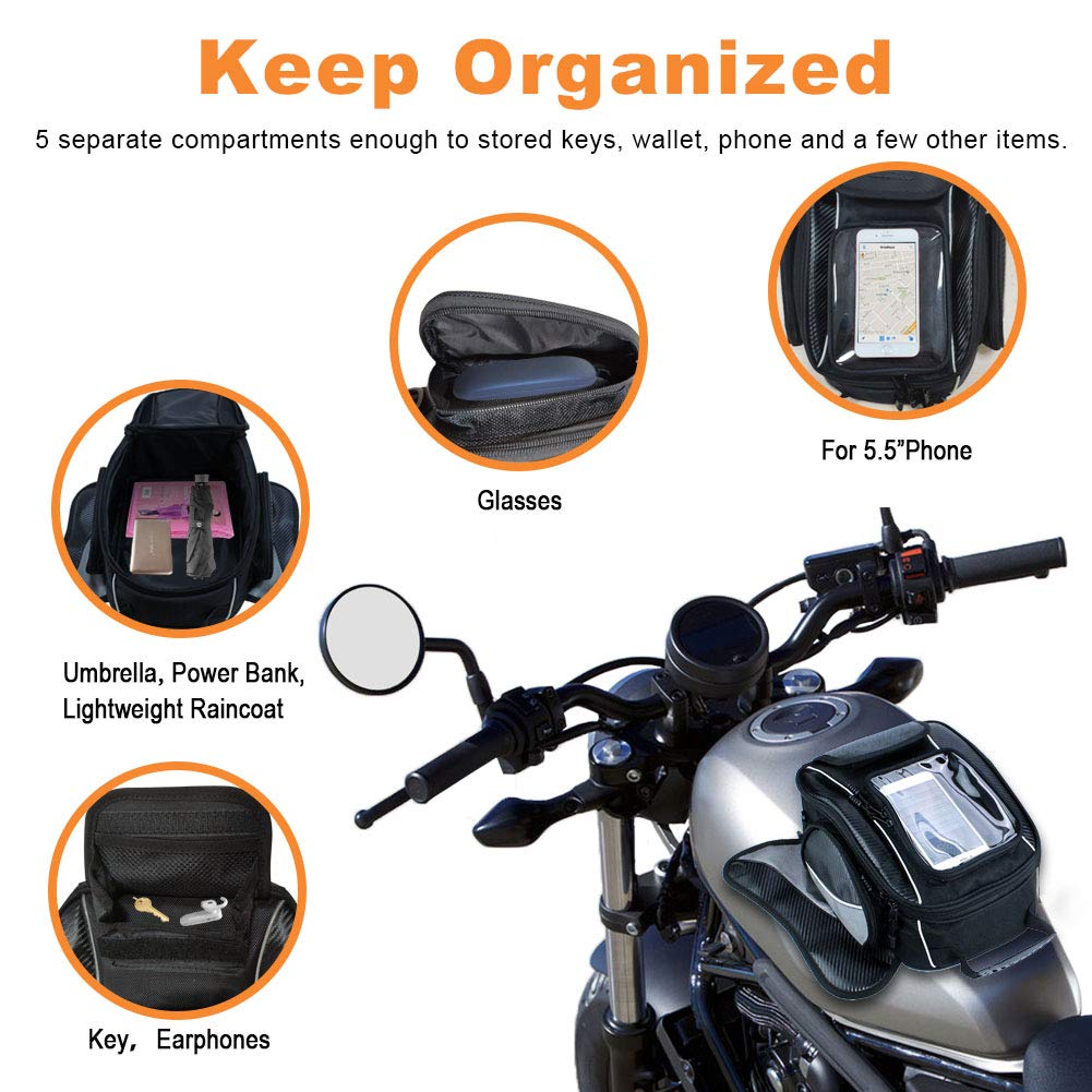 = Our bag adapts to most tanks except some special designed tanks, the problem of adaptability does not equate to quality. You just buy freely, if it doesn't fit, we refund 100%. = The motorcycle bag is crafted from tear resistant nylon fabric, very durable. = Easy to disassemble, can be used as shoulder bag, handbag, satchel, tank bag. = Powerful magnet to fasten the bag on motorcycle tank. = Additional fasten belt with buckle if you worry losing the bag. = The motorcycle tank bag size is 13.78 x 9.05 x 4.7 inches. = The motorbike bag is suitable for most Honda Yamaha Suzuki, etc. = The bag has a transparent cell phone bag, convenient to watch your phone. = The bag has 4 pockets, you can classify your belongings, such as wallet, iPads, card and a variety of car supplies.