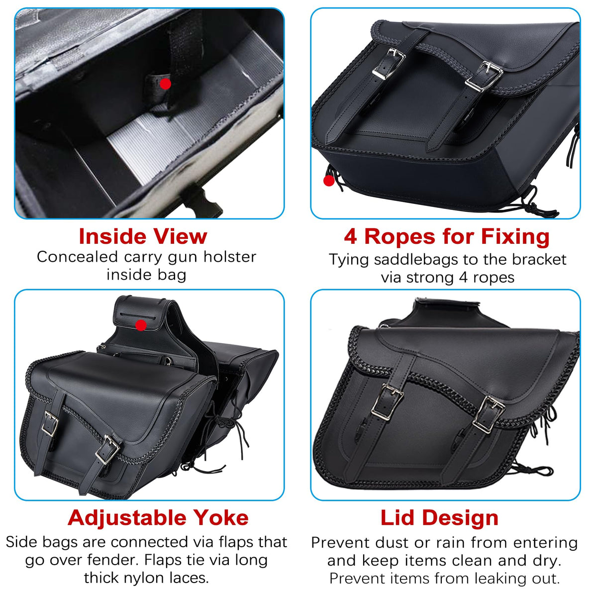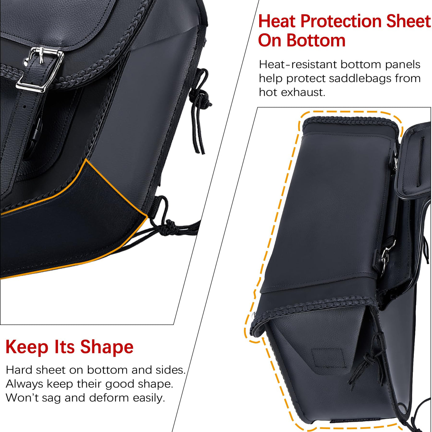 Q: Are the saddle bags waterproof and easy to clean?A: Yes, the saddle bags are made of durable man-made PVC material that is water-resistant, helping to keep your belongings dry during rainy conditions. The synthetic leather material also resists dust, making the bags easy to clean and maintain.