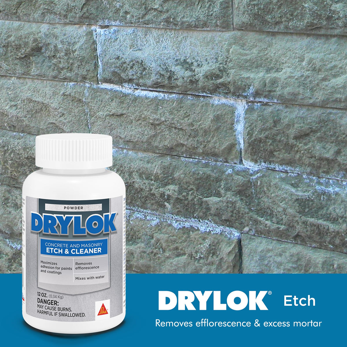 Product DescriptionDRYLOK® Powder Concrete and Masonry Etch & Cleaner prepares interior/exterior masonry and concrete for waterproofing and painting.DRYLOK® Etch is highly effective in etching masonry, stone, tile, and brick. It removes unsightly efflorescence (salt deposits) as well as excess mortar. Use DRYLOK® Etch, as a safer alternative to muriatic acid and is not activated until mixed with water for safe storage. It is perfect for treating smooth concrete and condition galvanized surfaces prior to painting. Clean up: Water Coverage: 300 square feet per 12 ounce container when used as a cleaner. 150 square feet per 12 ounce container when used as an etch.From the ManufacturerDRYLOK ETCH masonry cleaner helps prepare concrete, stone, tile and brick for painting. Remove efflorescence and excess mortar from masonry and concrete surfaces. DRYLOK 12 oz. Etch can be used on surfaces inside and outside your home.