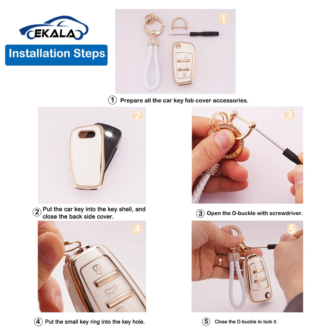 Q: What accessories are included with the EKALA Car Key Cover?A: The EKALA Car Key Cover package comes with a TPU key cover, an anti-lost buckle, a bling keychain, two small key rings, a handwoven lanyard, and a screwdriver. These accessories not only enhance the functionality of your key cover but also add a stylish touch.