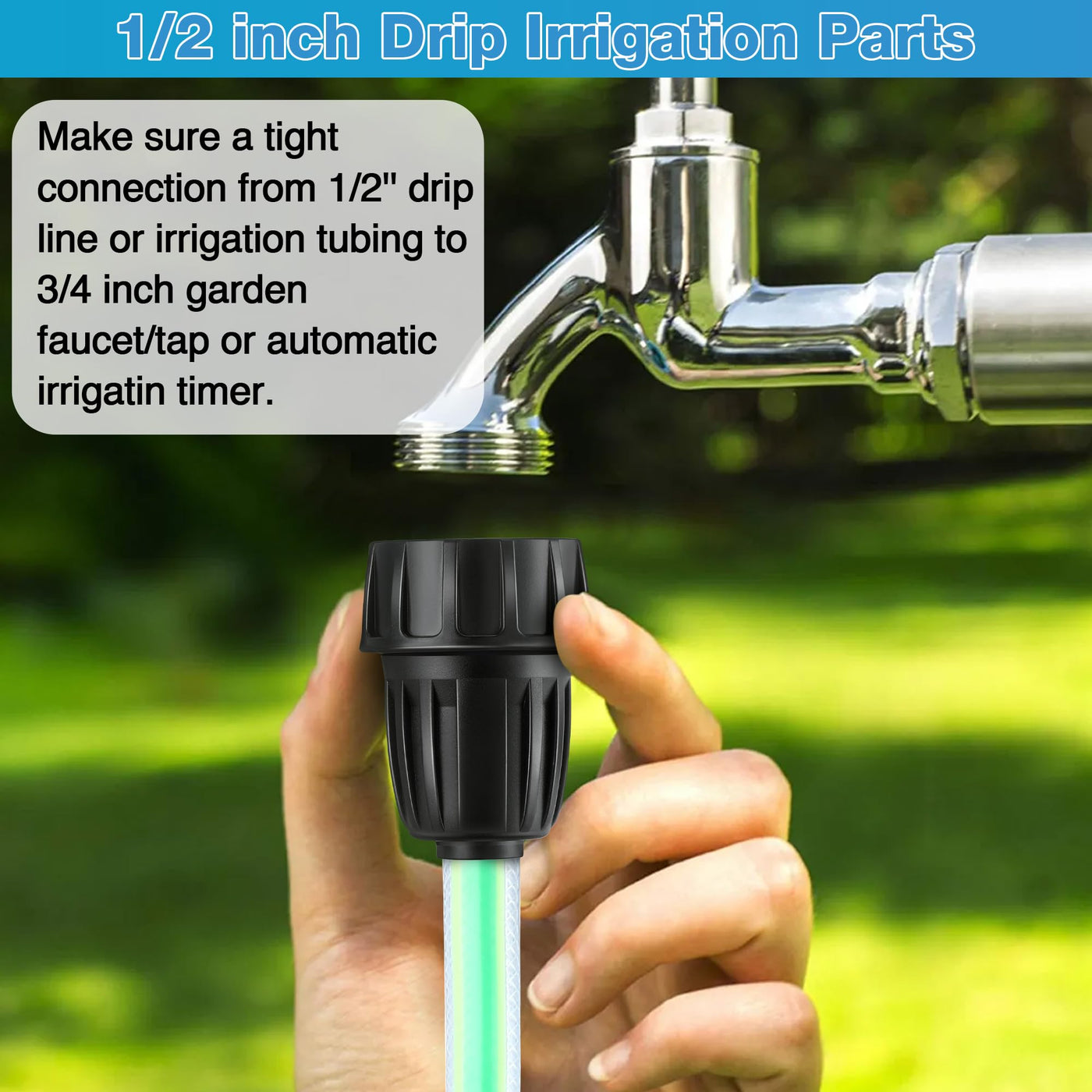 1/2'' Drip Irrigation Tubing Adapters Connect Irrigation to Water Supply The essential connection between your drip system and water source. This adapter connects 1/2' Irrigation Tubing to any standard 3/4' Faucet or Garden Hose.