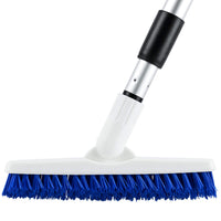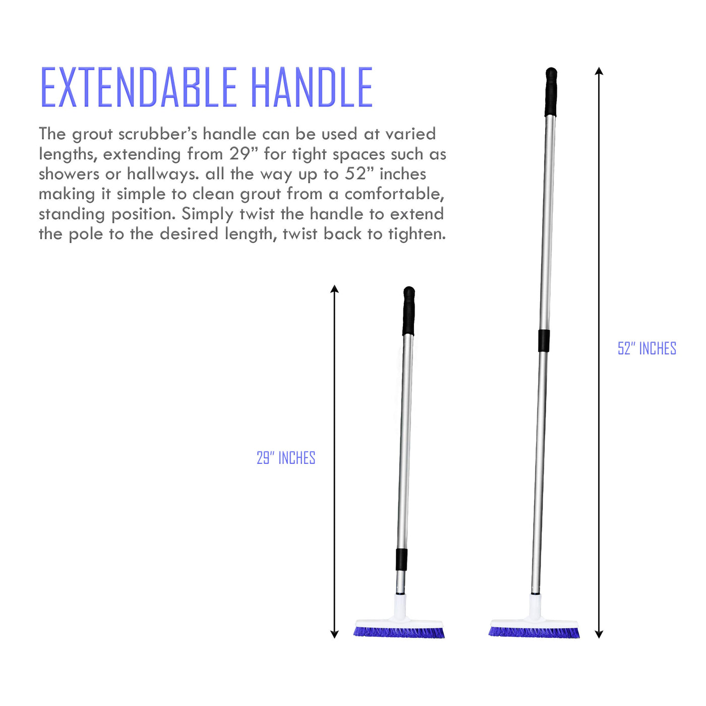 V' trim on the bristles allows the brush to easily fit into narrow and wide grout spots. | Tough and durable bristles do a thorough and tough cleaning but are gentle enough not to scratch any surfaces. | Grout scrubber swivels and pivots for the best cleaning angle for large areas and smaller areas like a backsplash or shower. | Telescopic pole extends from 29 inches to 52 inches. Scrub grout without getting on your knees. | For easy cleaning, simply detach the scrubber and clean with water.