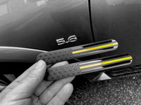 2-Pack. Made of Aircraft Aluminum, Embossed. Flexible. Thickness: 1mm.. Hand polished and Black Glossy/Matte finish. Comes with clear plastic shrink-wrap protecting the surface. (The protective plastic shrink-wrap needs to be removed after installation). UV Resistant. Durable enough to last under all weather conditions. Emblem Size : 6'x1' Comes with 3M adhesive back for stick on.