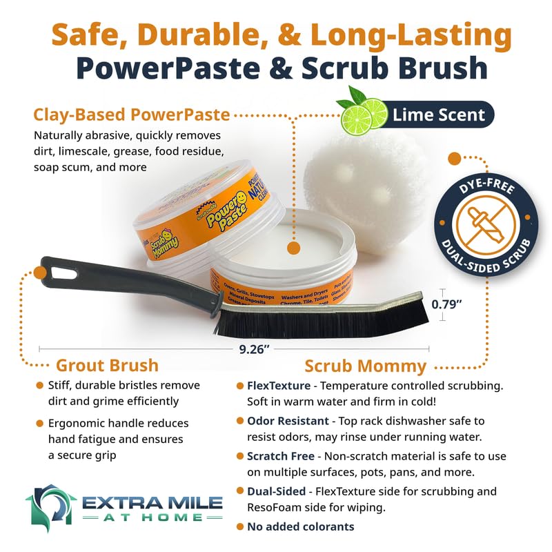Q: What makes the Extra Mile Home Power Paste different from other cleaners?A: The Extra Mile Home Power Paste stands out due to its efficiency in tackling grout stains, its eco-friendly formulation, and the inclusion of a durable scrub brush, which reduces the need for multiple cleaning products.