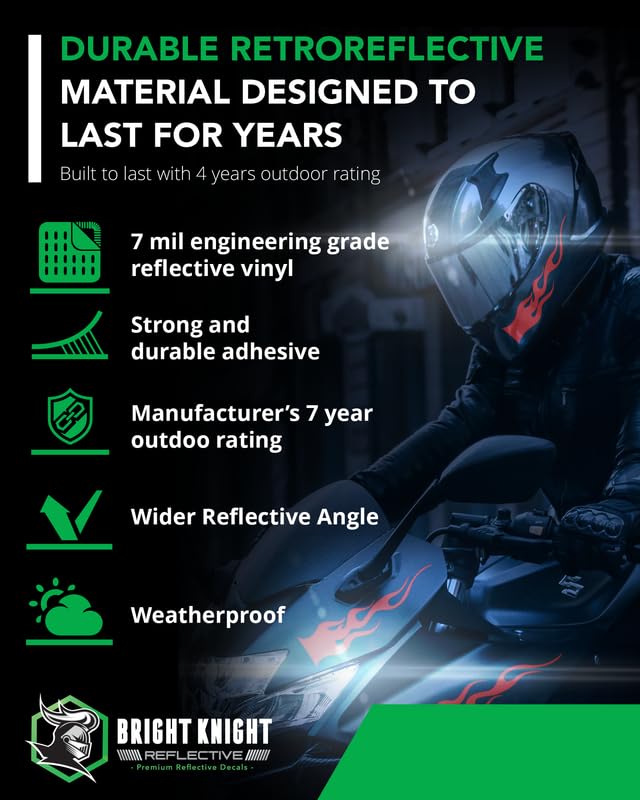 Be seen in the times you need! Bright Knight Decals presents 4 retro-reflective flame decals that come as 2 right hand flames, and 2 left hand flames (2 are mirrored from the other two) and are perfect for your helmet, motorcycle, bike, hard hat and other applications where you need to be seen to be safe in low light conditions. We do the cutting, we do the warranty and this material is rated for 7 years indoor or outdoor by 3M.