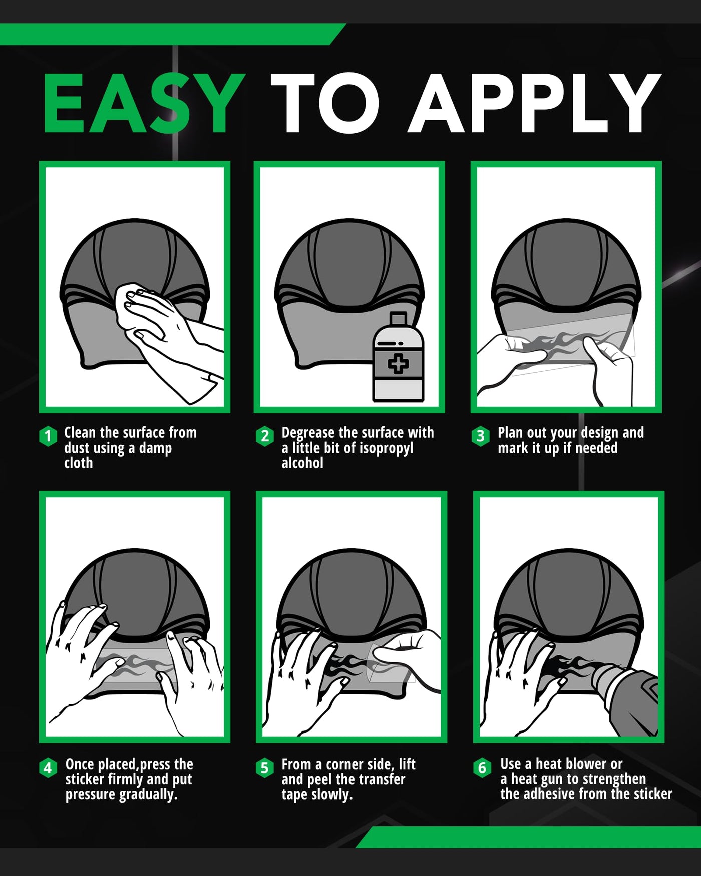 Q: What are Flame Decals Reflective used for?A: Flame Decals Reflective are designed for a variety of applications including helmets, motorcycles, bikes, hard hats, computers, phones, and tablets. They enhance visibility in low light conditions, making them ideal for safety.