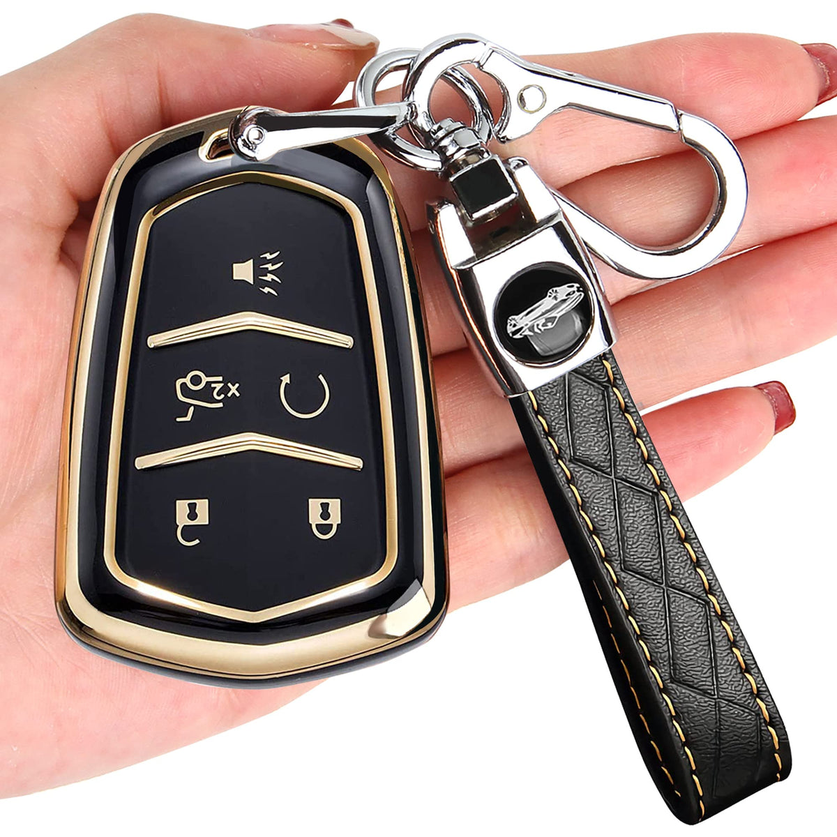 Compatibility: for Cadillac key fob cover is designed for Cadillac CT6, XT5, CTS, XTS SRX ATS, etc. 5 button key fob Package includes: 1 x for Cadillac key fob cover, 1 x for Cadillac key chain, 1 x screwdriver