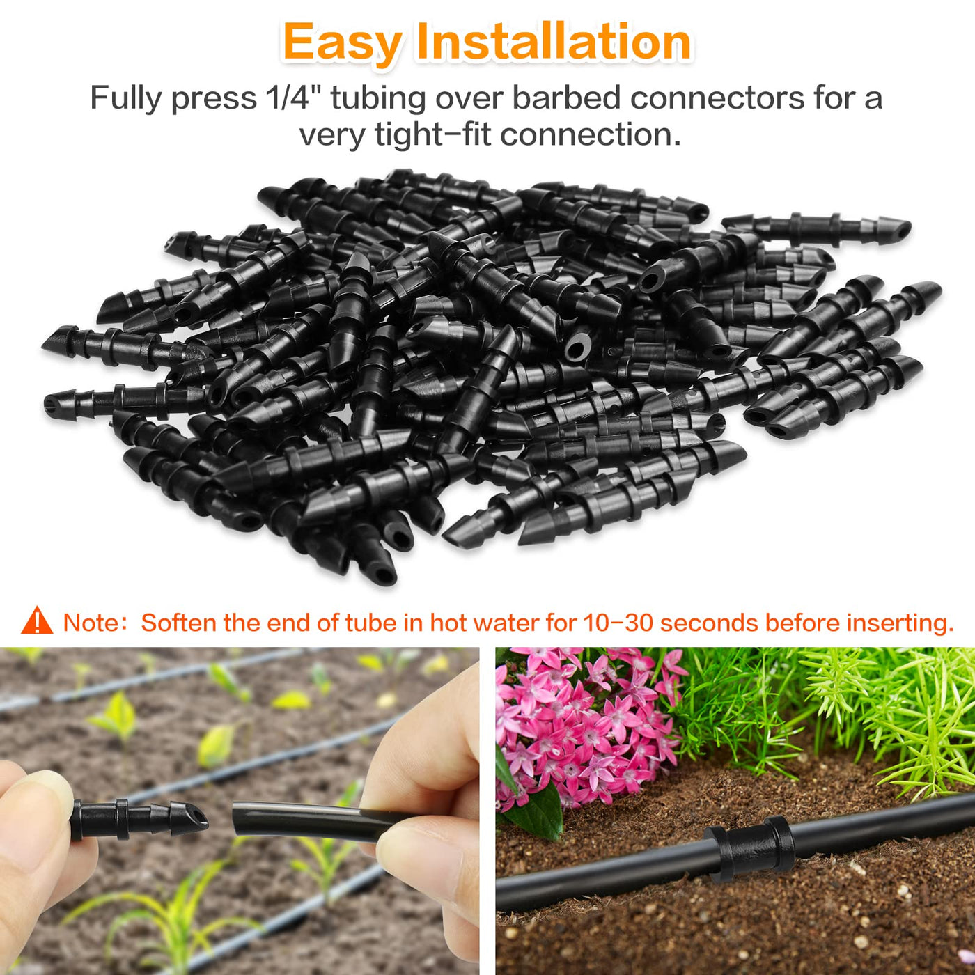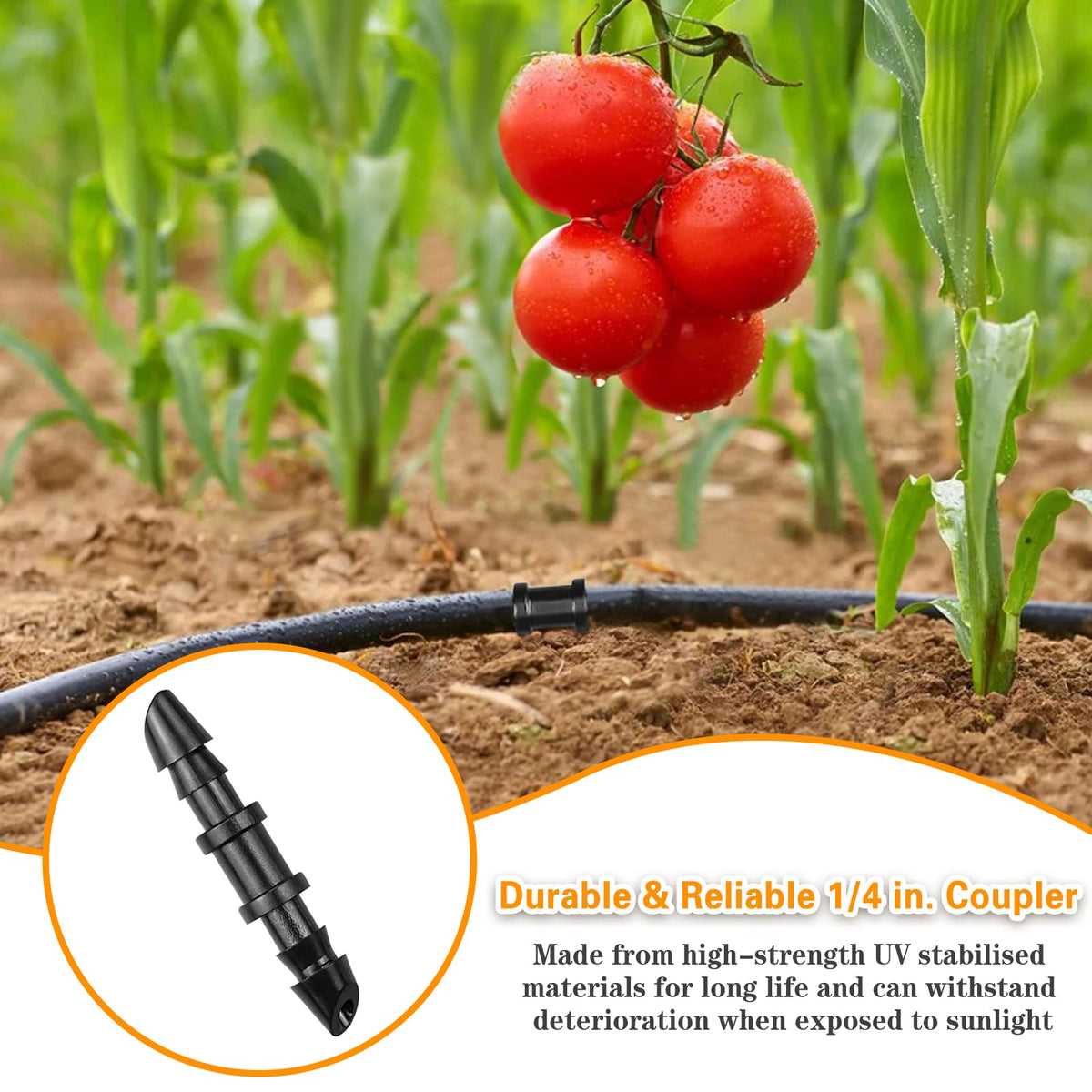 Gardrip drip irrigation barbed coupling fitting fits 1/4' drip irrigation tubing perfectly. This barbed coupling connector is designed to quickly and easily connect drip irrigation tubing. This set of 1/4 inch drip tubing connectors is a great value and all of the pieces seem well-formed, without any flashing or other glitches. High quality barbed connectors grab all brands of 1/4 inch. drip tubing tightly, creating a fast, leak-proof connection that stays in place full irrigation system life. It works perfectly to repair or extend tubing in a drip irrigation system - the 1/4 inch hose slides on easily and stays on without leaks. With this 1/4 inch coupling fittings, you can evenly waters trees, shrubs, flower beds, vegetable gardens, potted plants, and hanging baskets. As part of a complete garden irrigation system kit, drip irrigation fittings kit are connectors that attach sections of tubing together, or attach tubing to other drip irrigation parts. A necessity for drip irrigation systems, ideal for making repairs to or customizing drip watering systems.