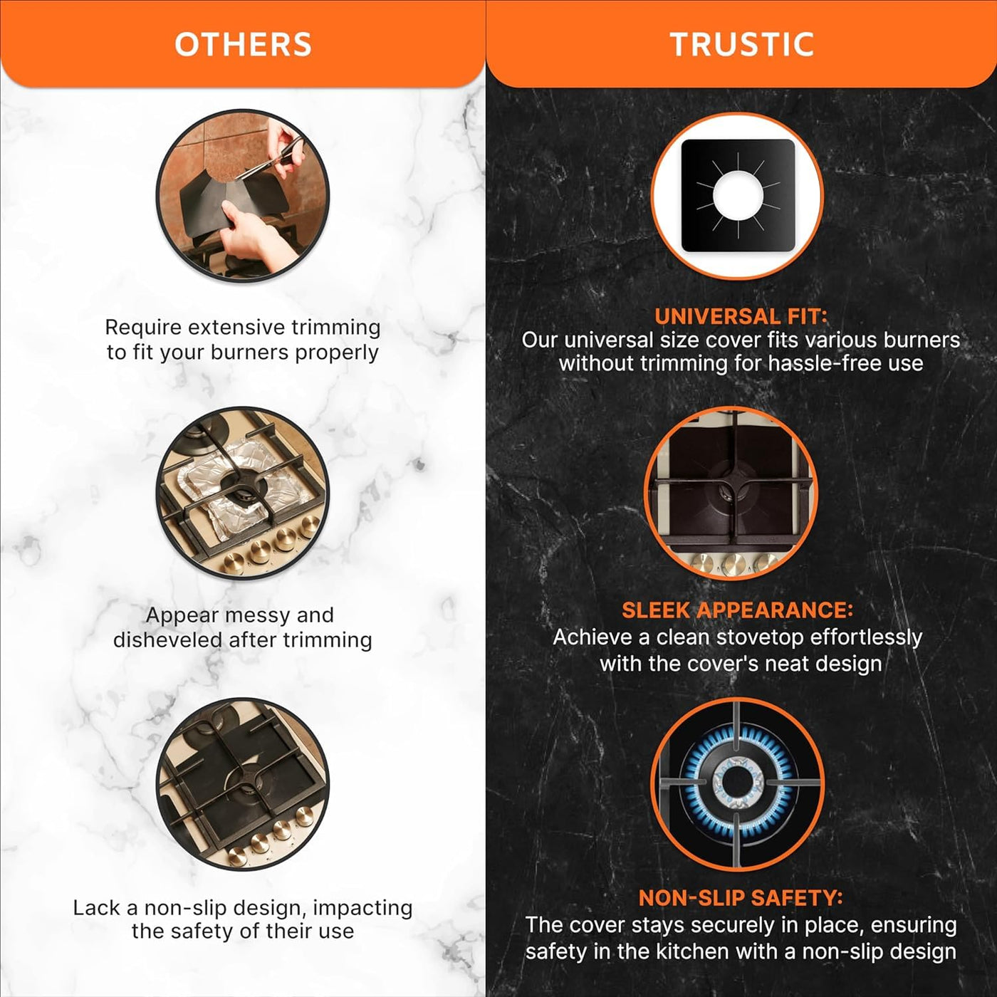 Q: Are these burner covers compatible with all gas stove sizes?A: Our gas stove protectors are crafted to fit most standard gas burners, measuring 8.5" x 8.5" with a 3.7" opening diameter. They can also be easily trimmed with scissors for a customized fit on different burner sizes.