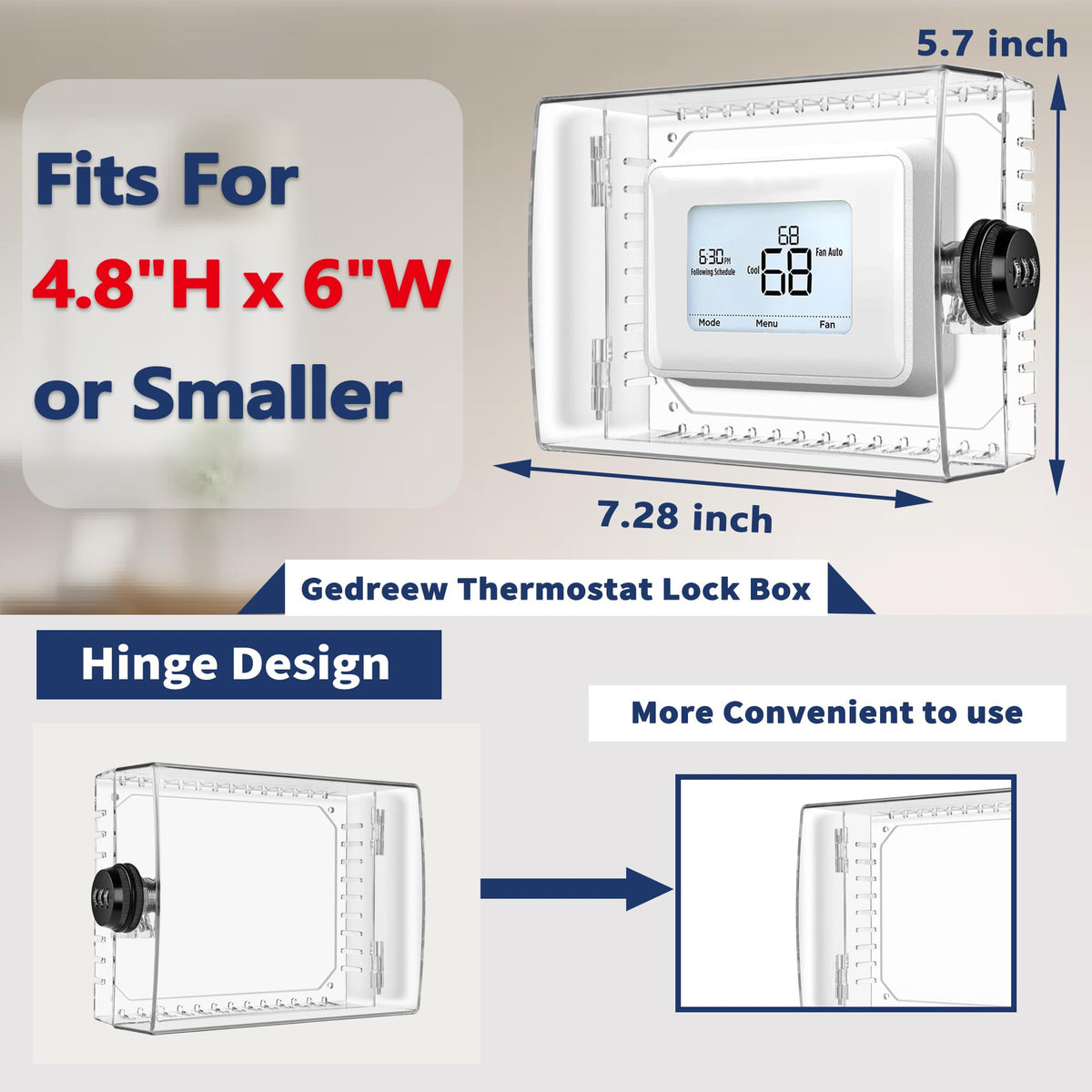 Q: What are the dimensions of the Gedreew Thermostat Lock Box?A: The Gedreew Thermostat Lock Box is designed to fit thermostats measuring 8.25"W x 5.75"H x 2.75"D or smaller, making it compatible with a wide range of thermostat models.