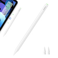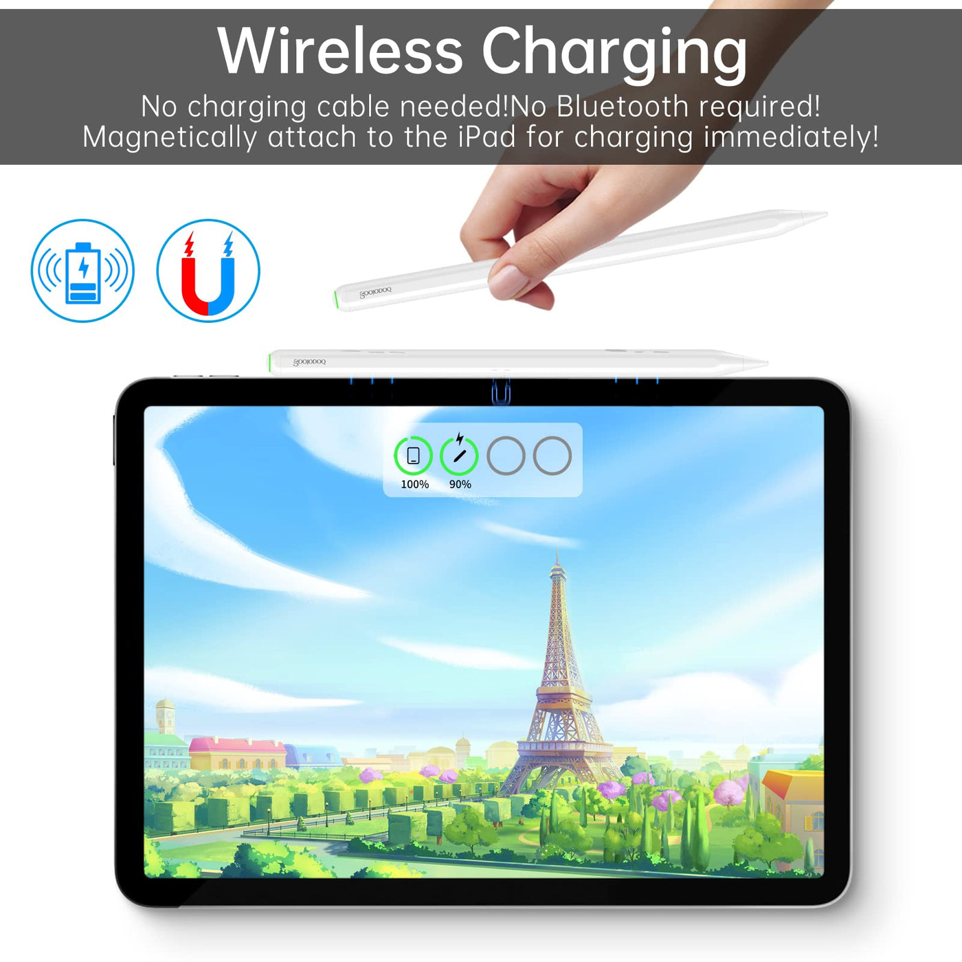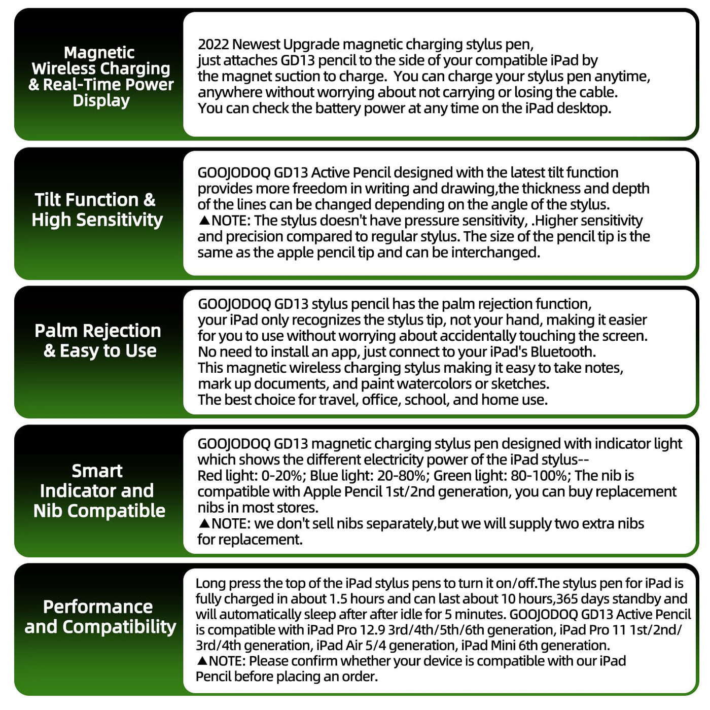 ???Magnetic Wireless Charging & Real-Time Power Display?-- 2022 Newest Upgrade magnetic charging stylus pen,just attaches GD13 pencil to the side of your compatible iPad by the magnet suction to charge. You can charge your stylus pen anytime, anywhere without worrying about not carrying or losing the cable. You can check the battery power at any time on the iPad desktop. | ???Tilt Function & High Sensitivity?--GOOJODOQ GD13 Active Pencil designed with the latest tilt function provides more freedom in writing and drawing,the thickness and depth of the lines can be changed depending on the angle of the stylus. ?NOTE: The stylus doesn't have pressure sensitivity, .Higher sensitivity and precision compared to regular stylus. The size of the pencil tip is the same as the apple pencil tip and can be interchanged. | ???Palm Rejection & Easy to Use?--GOOJODOQ GD13 stylus pencil has the palm rejection function, your iPad only recognizes the stylus tip, not your hand, making it easier for you to use without worrying about accidentally touching the screen. No need to install an app, just connect to your iPad's Bluetooth. This magnetic wireless charging stylus making it easy to take notes, mark up documents, and paint watercolors or sketches. The best choice for travel, office, school, and home use. | ???Smart Indicator and Nib Compatible?--GOOJODOQ GD13 magnetic charging stylus pen designed with indicator light which shows the different electricity power of the iPad stylus-- Red light: 0-20%; Blue light: 20-80%; Green light: 80-100%; The nib is compatible with Apple Pencil 1st/2nd generation, you can buy replacement nibs in most stores.?NOTE: we don't sell nibs separately,but we will supply two extra nibs for replacement. | ?? ?Performance and Compatibility? Long press the top of the iPad stylus pens to turn it on/off.The stylus pen for iPad is fully charged in about 1.5 hours and can last about 10 hours,365 days standby and will automatically sleep after idle for 5 minutes. This Active Pen is compatible with iPad Pro 12.9 3rd/4th/5th/6th Gen, iPad Pro 11 1st/2nd/3rd/4th Gen, iPad Air 5/4 Gen, iPad Mini 6th Gen.?NOTE: Please confirm whether your device is compatible with our iPad Pencil before placing an order