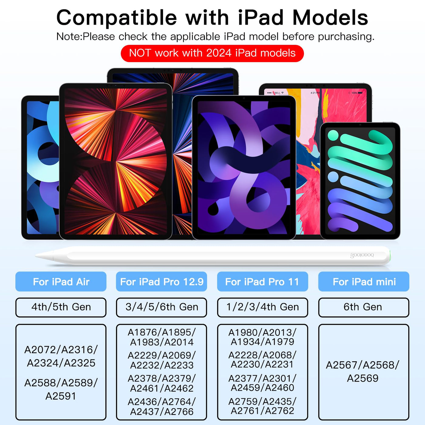 Q: Is the GOOJODOQ GD13 stylus compatible with my iPad model?A: The GOOJODOQ GD13 stylus is compatible with various iPad models, including the iPad Pro 12.9 (3rd to 6th Gen), iPad Pro 11 (1st to 4th Gen), iPad Air (4th and 5th Gen), and iPad Mini (6th Gen). Please confirm your device's compatibility before purchasing.