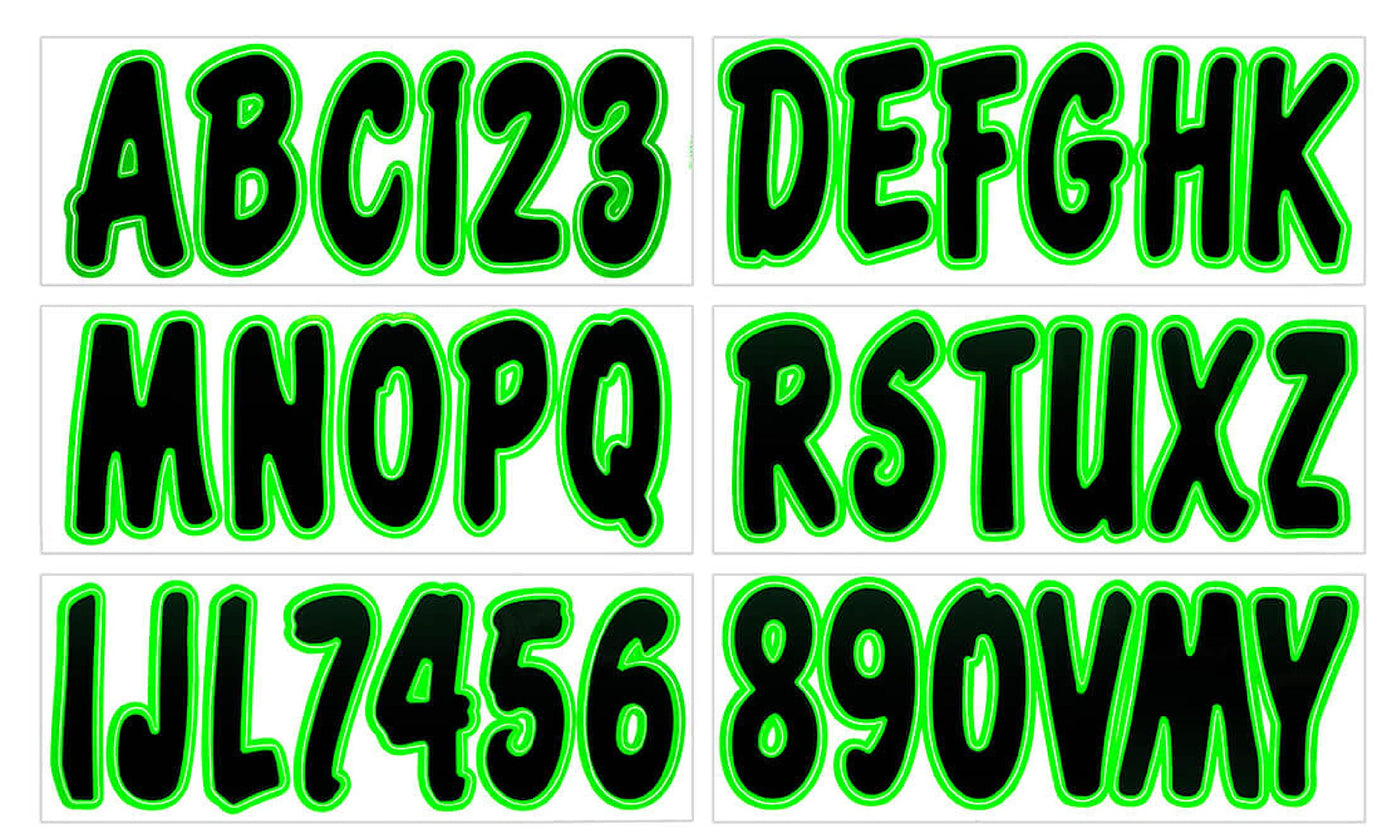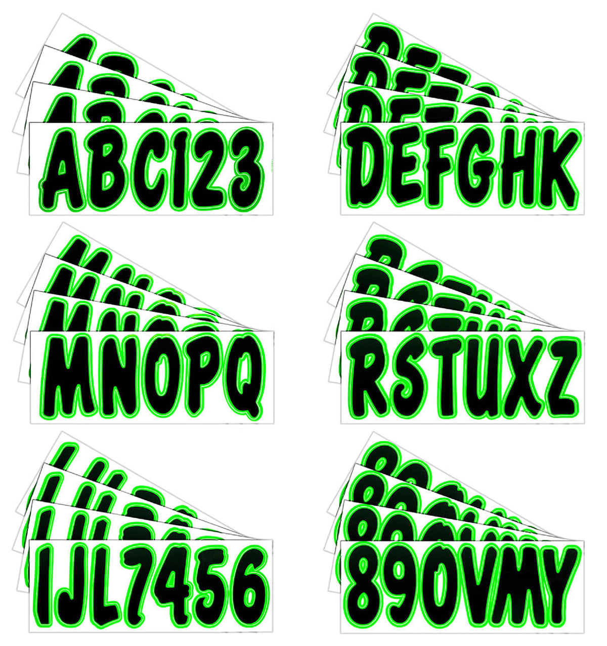 This Series 200 Factory Matched 3-Inch Registration Kit From Hardline Products In Black/Kiwi Green For Boats And Power Watercraft Model Blkki200 Features A Smooth Cursive Font With Top To Bottom Color Gradations. This Kit Contains Four Sets Of A-Z Letters And Four Sets Of 0-9 Numerals. Easy To Mount -- Just Peel And Apply. These Registration Stickers Are Uv Coated To Protect From Fading, And They'Re Also Fuel And Scratch Resistant. They'Re Made From 100 Percent Lead Free Inks And Vinyl With A Waterproof Superstick Adhesive, And They'Re Tested To Speeds Up To 100 Mph. The 3-Inch Registration Sticker Height Meets Uscg Requirements When Installed Correctly. Hardline Products Is An Industry Leader In After-Market Power Sports Accessories, Offering Matched Registration Letter And Number Kits, Decal Application And Removal Fluid, And More For On- And Off-Road Motorcycles, Boating, Personal Watercraft, All Terrain Vehicles Atvs, Snowmobiles, And Karting. Made In The Usa.