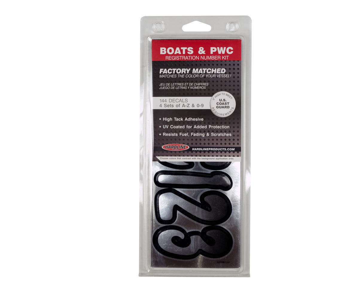This Series 200 Factory Matched 3-Inch Registration Kit From Hardline Products In Chrome/Black For Boats And Power Watercraft (Model Chbkg200) Features A Smooth Cursive Font With Top To Bottom Color Gradations. This Kit Contains Four Sets Of A-Z Letters And Four Sets Of 0-9 Numerals. Easy To Mount Just Peel And Apply. These Registration Stickers Are Uv Coated To Protect From Fading, And They'Re Also Fuel And Scratch Resistant. They'Re Made From 100 Percent Lead Free Inks And Vinyl With A Waterproof Superstick Adhesive, And They'Re Tested To Speeds Up To 100 Mph. The 3-Inch Registration Sticker Height Meets Uscg Requirements When Installed Correctly. Hardline Products Is An Industry Leader In After-Market Power Sports Accessories, Offering Matched Registration Letter And Number Kits, Decal Application And Removal Fluid, And More For On- And Off-Road Motorcycles, Boating, Personal Watercraft, All Terrain Vehicles (Atvs), Snowmobiles, And Karting. Made In The Usa.