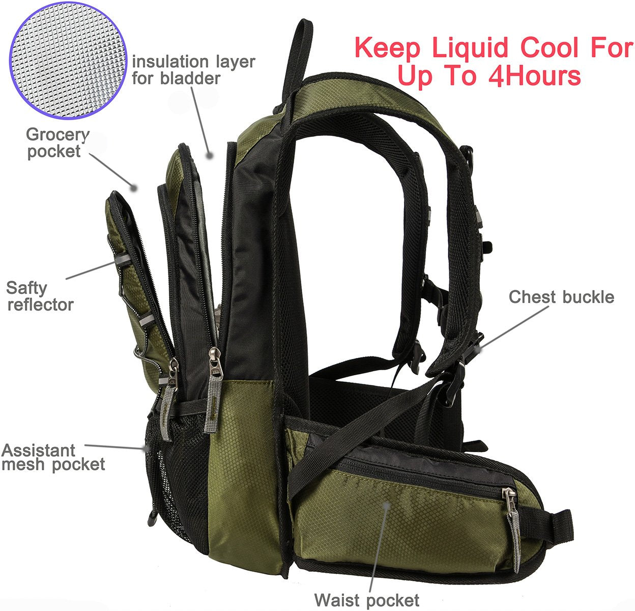 Q: How long can the insulated bladder keep my drink cool?A: The insulated bladder compartment is designed to keep your drink cool for up to 4 hours, making it ideal for outdoor activities such as running, hiking, and cycling.