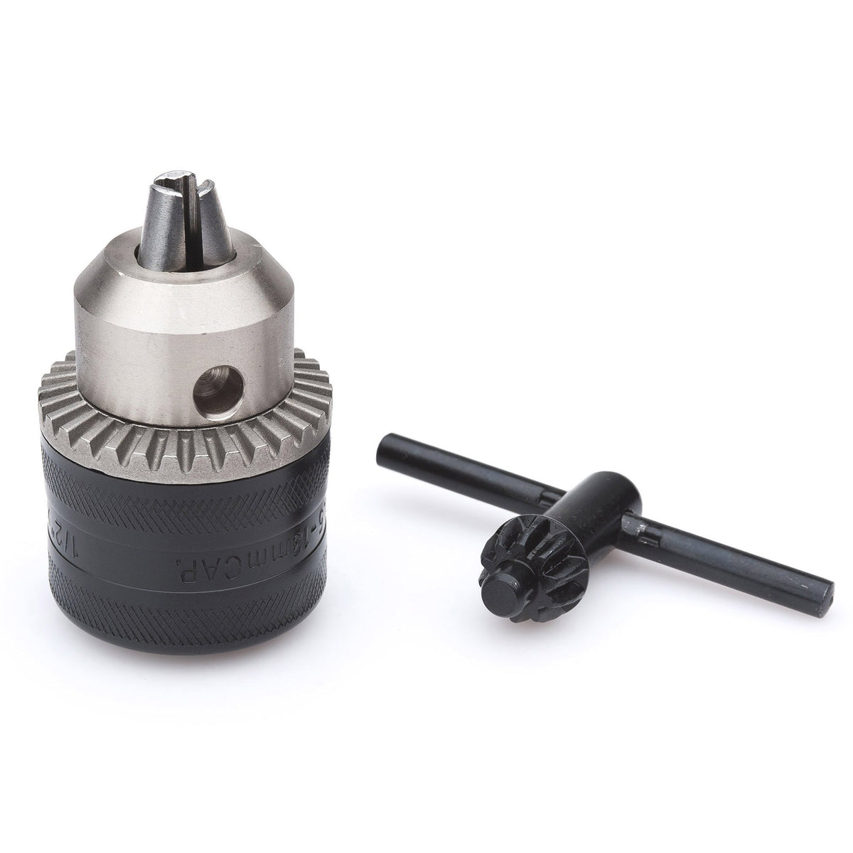 Q: How do I use the included chuck key with the Jacobs Chuck?A: To use the chuck key, insert it into the key slot on the chuck and turn it to tighten or loosen the grip on the drill bit securely.