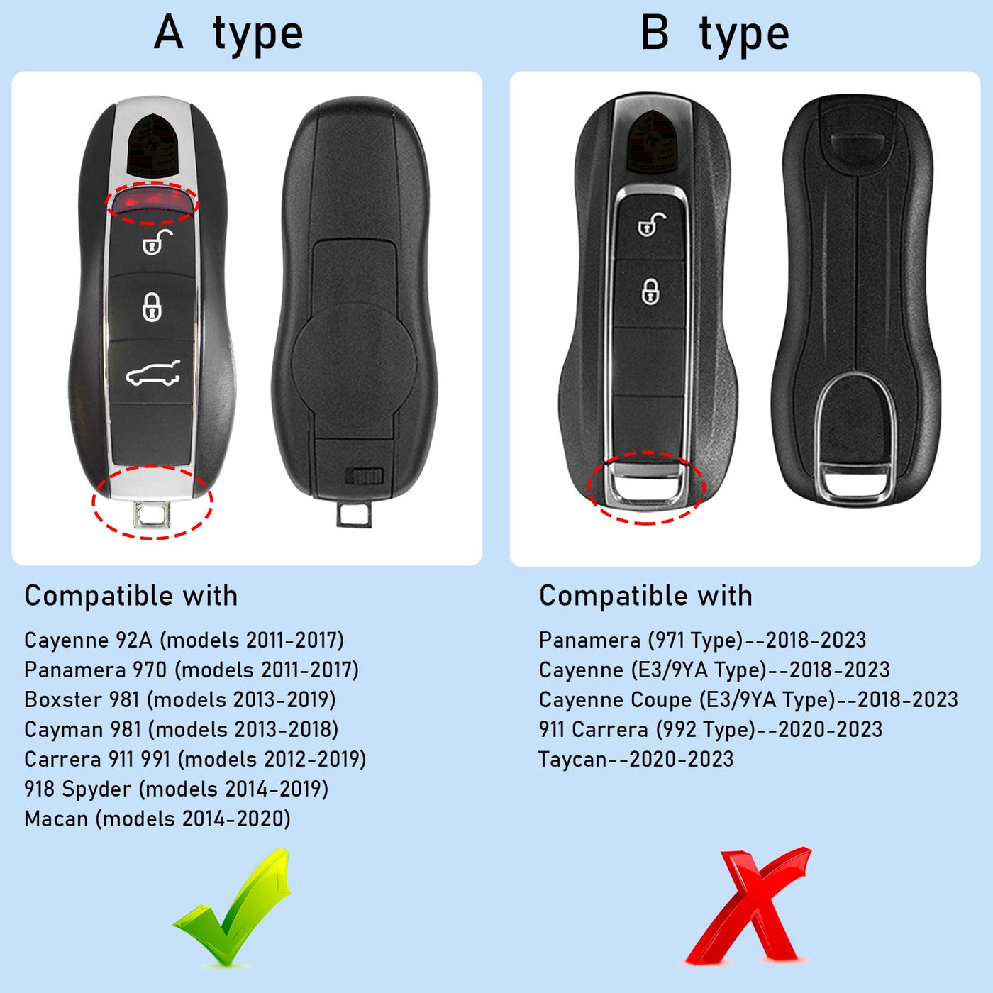 Compatible Vehicles Compatible With Cayenne Key Fob Cover: 92A (2011-2017) Compatible With Panamera Key Fob Cover: 970 (2011-2017) Compatible With Boxster Key Fob Cover: 981 (2013-2019) Compatible With Cayman Key Fob Cover: 981 (2013-2018) Compatible With Carrera Key Fob Cover: 911 991 (2012-2019) Compatible With 918 Spyder Key Cover (2014-2019) Compatible With Macan Key Fob Cover (2014-2020)